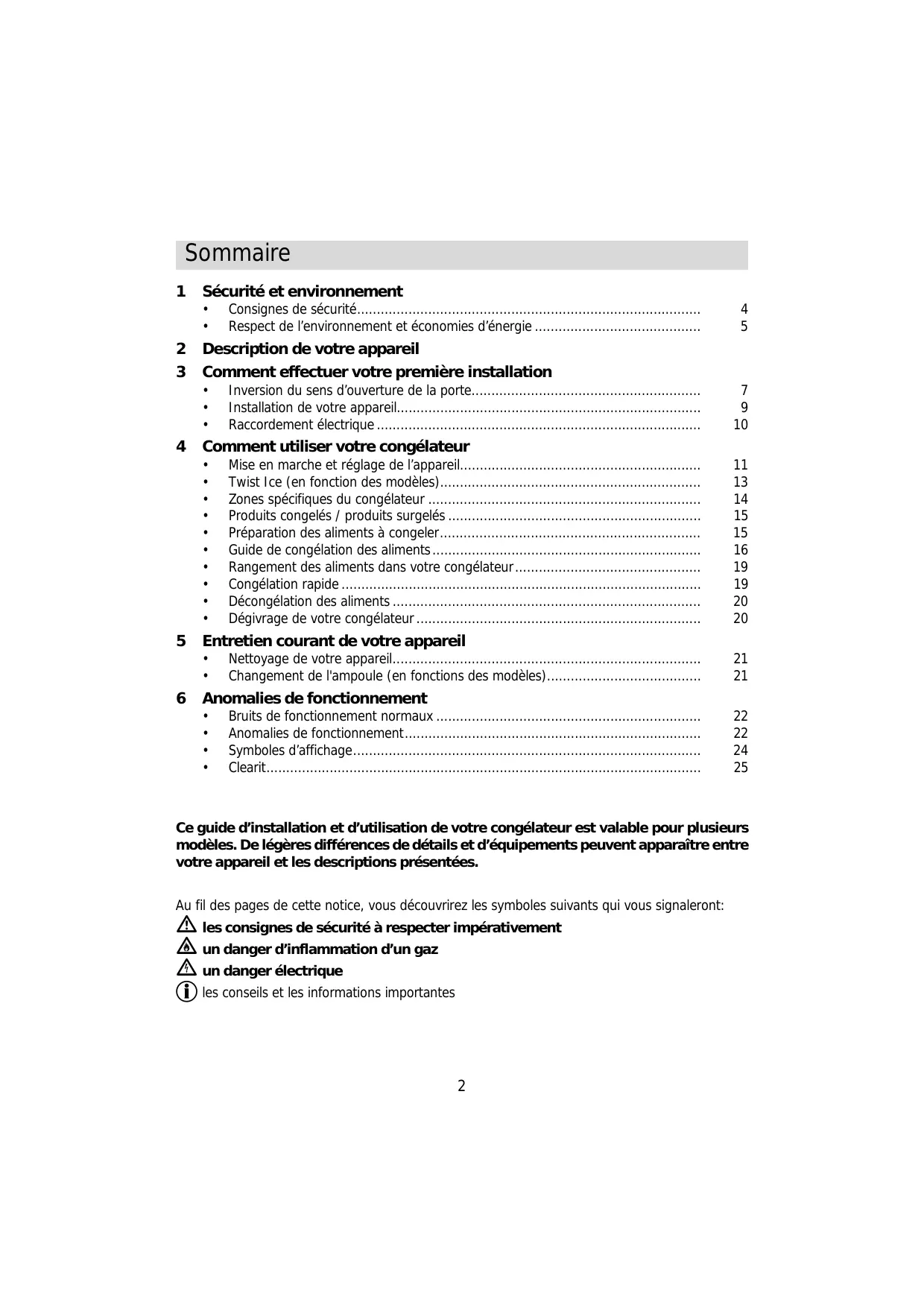 Ce guide d’installation et d’utilisation de votre congélateur est valable pour plusieurs modèles. De légères différences de détails et d’équipements peuvent apparaître entre votre appareil et les descriptions présentées. Au fil des pages de cette notice, vous découvrirez les symboles suivants qui vous signaleront: