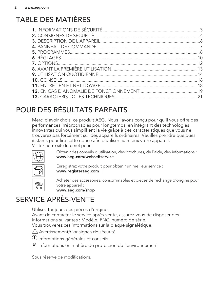 Merci d'avoir choisi ce produit AEG. Nous l'avons conçu pour qu'il vous offre des performances irréprochables pour longtemps, en intégrant des technologies innovantes qui vous simplifient la vie grâce à des caractéristiques que vous ne trouverez pas forcément sur des appareils ordinaires. Veuillez prendre quelques instants pour lire cette notice afin d'utiliser au mieux votre appareil. Visitez notre site Internet pour : Obtenir des conseils d'utilisation, des brochures, de l'aide, des informations : www.aeg.com/webselfservice Enregistrez votre produit pour obtenir un meilleur service : www.registeraeg.com Acheter des accessoires, consommables et pièces de rechange d'origine pour votre appareil : www.aeg.com/shop