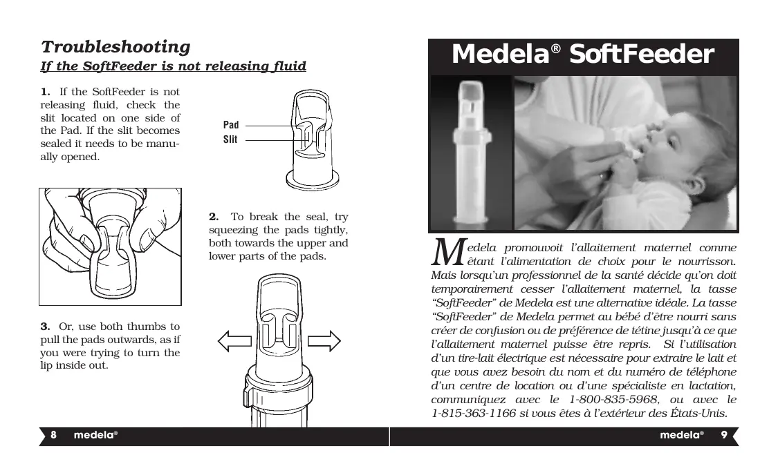 sur un des côtés du coussinet si aucun liquide ne sort. Si la fente est bouchée, il vous faudra la travailler avec vos mains pour l’ouvrir. Coussinet Fente La tasse fuit Si la tasse “SoftFeeder” fuit, vérifiez si elle a été assemblée de la bonne façon. Le goujon de la valve doit être inséré correctement dans le trou du disque. L’anneau doit être vissé fermement sur le contenant. Assurez-vous que le supplément ne soit pas trop chaud. La tasse “SoftFeeder” est conçu pour être utilisée avec des suppléments à température ambiante et ne doit pas être utilisée avec des liquides chauds. Vérifiez si la membrane de la valve et le réservoir ne sont pas endommagés et s’ils n’ont pas besoin d’être remplacés. Si vous voulez utiliser de plus grands contenants La tasse “SoftFeeder” de Medela est conçue pour être utilisée avec contenant de 80 ml fait de polypropylène. Certains autres contenants peuvent aussi être utilisés, toutefois il est possible qu’il se produise de légères fuites autour de l’anneau.