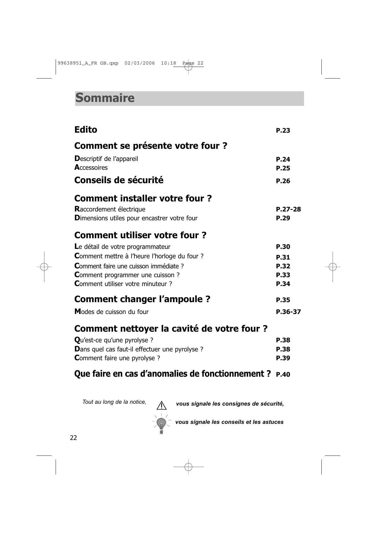 Merci de prendre connaissance de ces conseils avant d’installer et d’utiliser votre four. Ce four a été conçu pour être utlilisé par des particuliers dans leur lieu d’habitation. Il est destiné exclusivement à la cuisson des denrées alimentaires. Ce four ne contient aucun composant à base d’amiante. PREMIERE UTILISATION : Avant d’utiliser votre four pour la première fois, chauffer le à vide, porte fermée, pendant 15 minutes environ sur la position maxi afin de “roder” l’appareil. La laine minérale qui entoure la cavité du four peut dégager, au début, une odeur particulière due à sa composition. De même, vous constaterez peut-être un dégagement de fumée. Tout ceci est normal. UTILISATIONS SUIVANTES : - Assurez vous que votre porte de four est bien fermée afin que le joint d’étanchéité remplisse correctement sa fonction. - Ne laissez personne s’appuyer ou s’asseoir sur la porte du four ouverte. - Lors de l’utilisation du gril porte entre-ouverte, les parties accessibles ou les surfaces peuvent devenir chaudes. Eloignez les jeunes enfants. - Lors de son utilisation, l’appareil devient chaud. Veillez à ne pas toucher les éléments chauffants situés à l’intérieur du four. - Après une cuisson, ne prenez pas à main nue la casserolerie (grille, tourne broche, léchefrite, berceau de tournebroche...), utilisez une manique ou un tissu isolant. - Ne garnissez pas votre four de feuilles en aluminium. Sinon, il en résulterait une accumulation de chaleur qui influencerait désavantageusement le résultat de la cuisson et du rôtissage et endommagerait l’émail. - Avant de procéder au nettoyage pyrolyse de votre four, retirez tous les éléments de casserolerie et enlevez les débordements importants. - Ne pas utiliser de nettoyeur vapeur ou à haute pression. - Pendant une pyrolyse, les surfaces accessibles deviennent plus chaudes qu’en usage normal. Eloigner les jeunes enfants. - Pour toute intervention de nettoyage dans la cavité du four, le four doit être arrêté. PROTECTION DE L’ENVIRONNEMENT Les matériaux d’emballage de cet appareil sont recyclables. Participez à leur recyclage et contribuez ainsi à la protection de l’environnement en les déposant dans les conteneurs municipaux prévus à cet effet. Votre appareil contient également de nombreux matériaux recyclables. Il est donc marqué de ce logo afin de vous indiquer que les appareils usagés ne doivent pas être mélangés avec d’autres déchets. Le recyclage des appareils qu’organise votre fabricant sera ainsi réalisé dans les meilleures conditions, conformément à la directive européenne 2002/96/CE sur les déchets d’équipements électriques et électroniques. Adressez vous à votre mairie ou à votre revendeur pour connaître les points de collecte des appareils usagés les plus proches de votre domicile. Nous vous remercions pour votre collaboration à la protection de l’environnement. Remettez impérativement le sélecteur de fonction sur 0 pour réutiliser votre four.