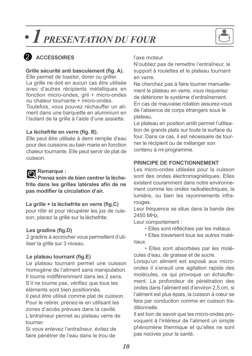 ACCESSOIRES Grille sécurité anti basculement (fig. A). Elle permet de toaster, dorer ou griller. La grille ne doit en aucun cas être utilisée avec d’autres récipients métalliques en fonction micro-ondes, gril + micro-ondes ou chaleur tournante + micro-ondes. Toutefois, vous pouvez réchauffer un aliment dans une barquette en aluminium en l’isolant de la grille à l’aide d’une assiette. La lèchefrite en verre (fig. B). Elle peut être utilisée à demi remplie d’eau pour des cuissons au bain marie en fonction chaleur tournante. Elle peut servir de plat de cuisson. Remarque : Prenez soin de bien centrer la lèchefrite dans les grilles latérales afin de ne pas modifier la circulation d’air. La grille + la lèchefrite en verre (fig.C) pour rôtir et pour récupérer les jus de cuisson, placez la grille sur la lèchefrite. Les gradins (fig.D) 2 gradins à accrocher vous permettent d’utiliser la grille sur 3 niveau. Le plateau tournant (fig.E) Le plateau tournant permet une cuisson homogène de l’aliment sans manipulation. Il tourne indifféremment dans les 2 sens. S’il ne tourne pas, vérifiez que tous les éléments sont bien positionnés. Il peut être utilisé comme plat de cuisson. Pour le retirer, prenez-le en utilisant les zones d’accès prévues dans la cavité. L’entraîneur permet au plateau verre de tourner. Si vous enlevez l’entraîneur, évitez de faire pénétrer de l’eau dans le trou de