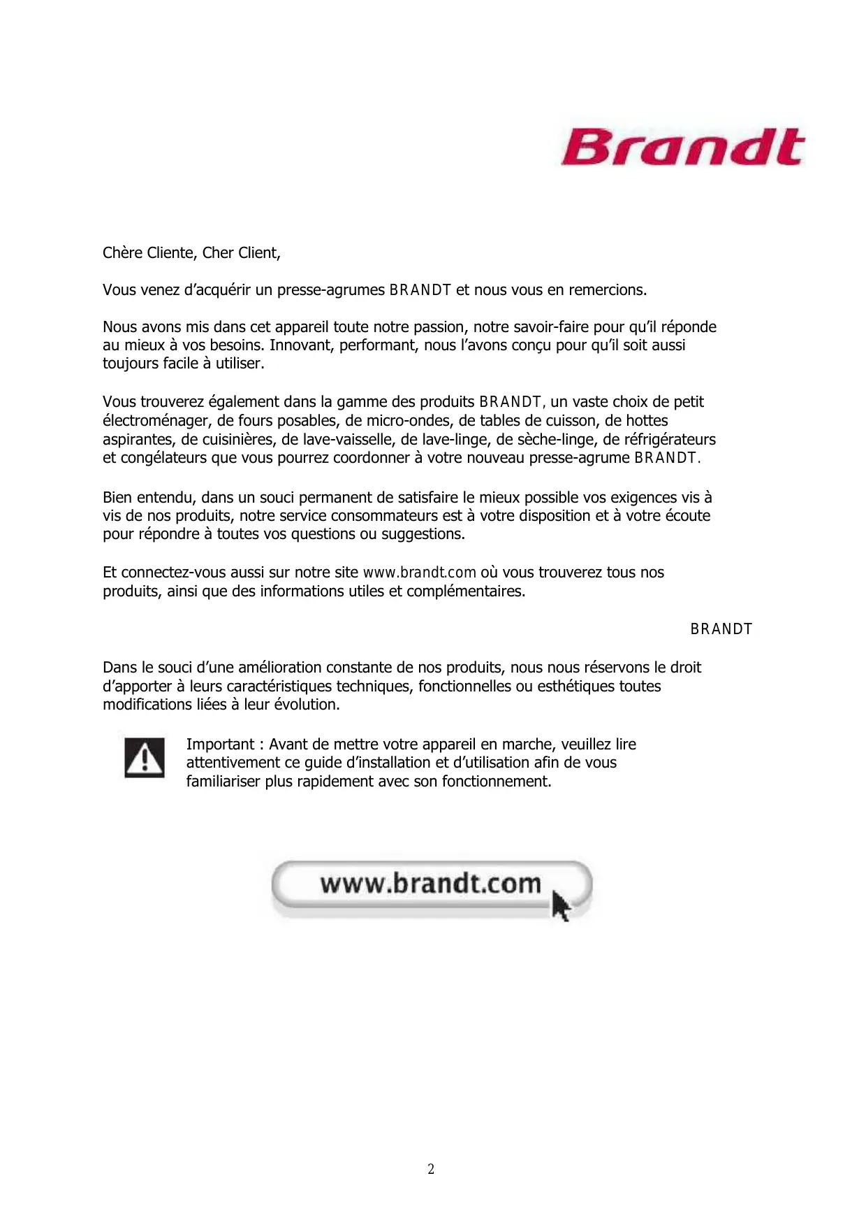 Et connectez-vous aussi sur notre site www.brandt.com où vous trouverez tous nos produits, ainsi que des informations utiles et complémentaires.