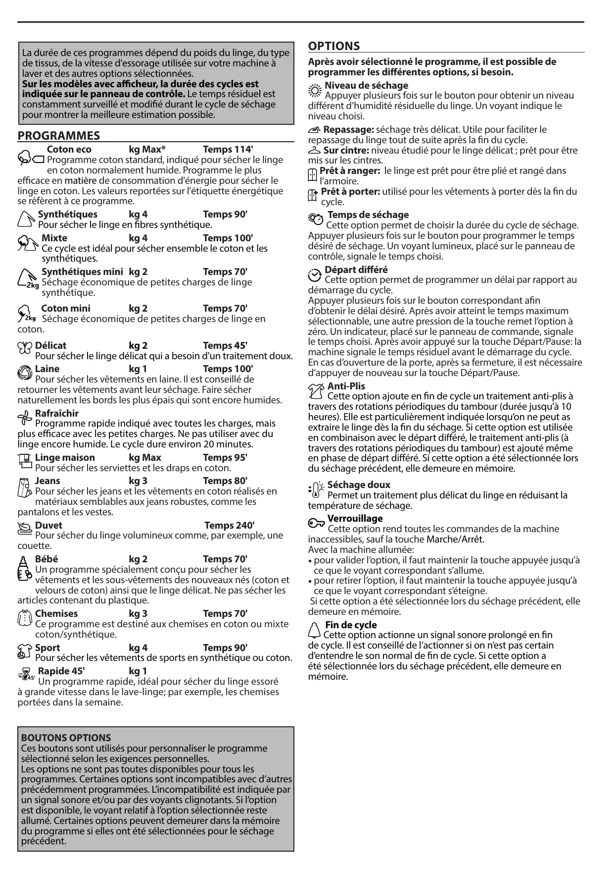 - Vous pouvez également contacter notre service après-ventesuivants (voir numéro de téléphone dans le livret de garantie). Lorsque xxxxxxxxxxxx vous contactez notre Service Après-vente, veuillez indiquer les codes visibles sur la plaque signalétique de l'appareil. Séchage en machine. Pas de séchage en machine. Séchage à haute température. Séchage à basse température. La durée de ces programmes dépend du poids du linge, du type de tissus, de la vitesse d'essorage utilisée sur votre machine à laver et des autres options sélectionnées. Sur les modèles avec afficheur, la durée des cycles est indiquée sur le panneau de contrôle. Le temps résiduel est constamment surveillé et modifié durant le cycle de séchage pour montrer la meilleure estimation possible. PROGRAMMES Coton eco kg Max* Temps 114' Programme coton standard, indiqué pour sécher le linge en coton normalement humide. Programme le plus efficace en matière de consommation d'énergie pour sécher le linge en coton. Les valeurs reportées sur l'étiquette énergétique se réfèrent à ce programme. Synthétiques kg 4 Temps 90' Pour sécher le linge en fibres synthétique. Mixte kg 4 Temps 100' Ce cycle est idéal pour sécher ensemble le coton et les synthétiques. Synthétiques mini kg 2 Temps 70' Séchage économique de petites charges de linge synthétique. Coton mini kg 2 Temps 70' Séchage économique de petites charges de linge en coton. Délicat kg 2 Temps 45' Pour sécher le linge délicat qui a besoin d'un traitement doux. Laine kg 1 Temps 100' Pour sécher les vêtements en laine. Il est conseillé de retourner les vêtements avant leur séchage. Faire sécher naturellement les bords les plus épais qui sont encore humides. Rafraîchir Programme rapide indiqué avec toutes les charges, mais plus efficace avec les petites charges. Ne pas utiliser avec du linge encore humide. Le cycle dure environ 20 minutes. Linge maison kg Max Temps 95' Pour sécher les serviettes et les draps en coton. Jeans kg 3 Temps 80' Pour sécher les jeans et les vêtements en coton réalisés en matériaux semblables aux jeans robustes, comme les pantalons et les vestes. Duvet Temps 240' Pour sécher du linge volumineux comme, par exemple, une couette. Bébé kg 2 Temps 70' Un programme spécialement conçu pour sécher les vêtements et les sous-vêtements des nouveaux nés (coton et velours de coton) ainsi que le linge délicat. Ne pas sécher les articles contenant du plastique. Chemises kg 3 Temps 70' Ce programme est destiné aux chemises en coton ou mixte coton/synthétique. Sport kg 4 Temps 90' Pour sécher les vêtements de sports en synthétique ou coton. Rapide 45' kg 1 45’ Un programme rapide, idéal pour sécher du linge essoré à grande vitesse dans le lave-linge; par exemple, les chemises portées dans la semaine. BOUTONS OPTIONS Ces boutons sont utilisés pour personnaliser le programme sélectionné selon les exigences personnelles. Les options ne sont pas toutes disponibles pour tous les programmes. Certaines options sont incompatibles avec d’autres précédemment programmées. L’incompatibilité est indiquée par un signal sonore et/ou par des voyants clignotants. Si l’option est disponible, le voyant relatif à l’option sélectionnée reste allumé. Certaines options peuvent demeurer dans la mémoire du programme si elles ont été sélectionnées pour le séchage précédent. OPTIONS Après avoir sélectionné le programme, il est possible de programmer les différentes options, si besoin. Niveau de séchage Appuyer plusieurs fois sur le bouton pour obtenir un niveau différent d’humidité résiduelle du linge. Un voyant indique le niveau choisi. Repassage: séchage très délicat. Utile pour faciliter le repassage du linge tout de suite après la fin du cycle. Sur cintre: niveau étudié pour le linge délicat ; prêt pour être mis sur les cintres. Prêt à ranger: le linge est prêt pour être plié et rangé dans l’armoire. Prêt à porter: utilisé pour les vêtements à porter dès la fin du cycle. Temps de séchage Cette option permet de choisir la durée du cycle de séchage. Appuyer plusieurs fois sur le bouton pour programmer le temps désiré de séchage. Un voyant lumineux, placé sur le panneau de contrôle, signale le temps choisi. Départ différé Cette option permet de programmer un délai par rapport au démarrage du cycle. Appuyer plusieurs fois sur le bouton correspondant afin d’obtenir le délai désiré. Après avoir atteint le temps maximum sélectionnable, une autre pression de la touche remet l’option à zéro. Un indicateur, placé sur le panneau de commande, signale le temps choisi. Après avoir appuyé sur la touche Départ/Pause: la machine signale le temps résiduel avant le démarrage du cycle. En cas d’ouverture de la porte, après sa fermeture, il est nécessaire d’appuyer de nouveau sur la touche Départ/Pause. Anti-Plis Cette option ajoute en fin de cycle un traitement anti-plis à travers des rotations périodiques du tambour (durée jusqu’à 10 heures). Elle est particulièrement indiquée lorsqu’on ne peut as extraire le linge dès la fin du séchage. Si cette option est utilisée en combinaison avec le départ différé, le traitement anti-plis (à travers des rotations périodiques du tambour) est ajouté même en phase de départ différé. Si cette option a été sélectionnée lors du séchage précédent, elle demeure en mémoire. Séchage doux Permet un traitement plus délicat du linge en réduisant la température de séchage. Verrouillage Cette option rend toutes les commandes de la machine inaccessibles, sauf la touche Marche/Arrêt. Avec la machine allumée: