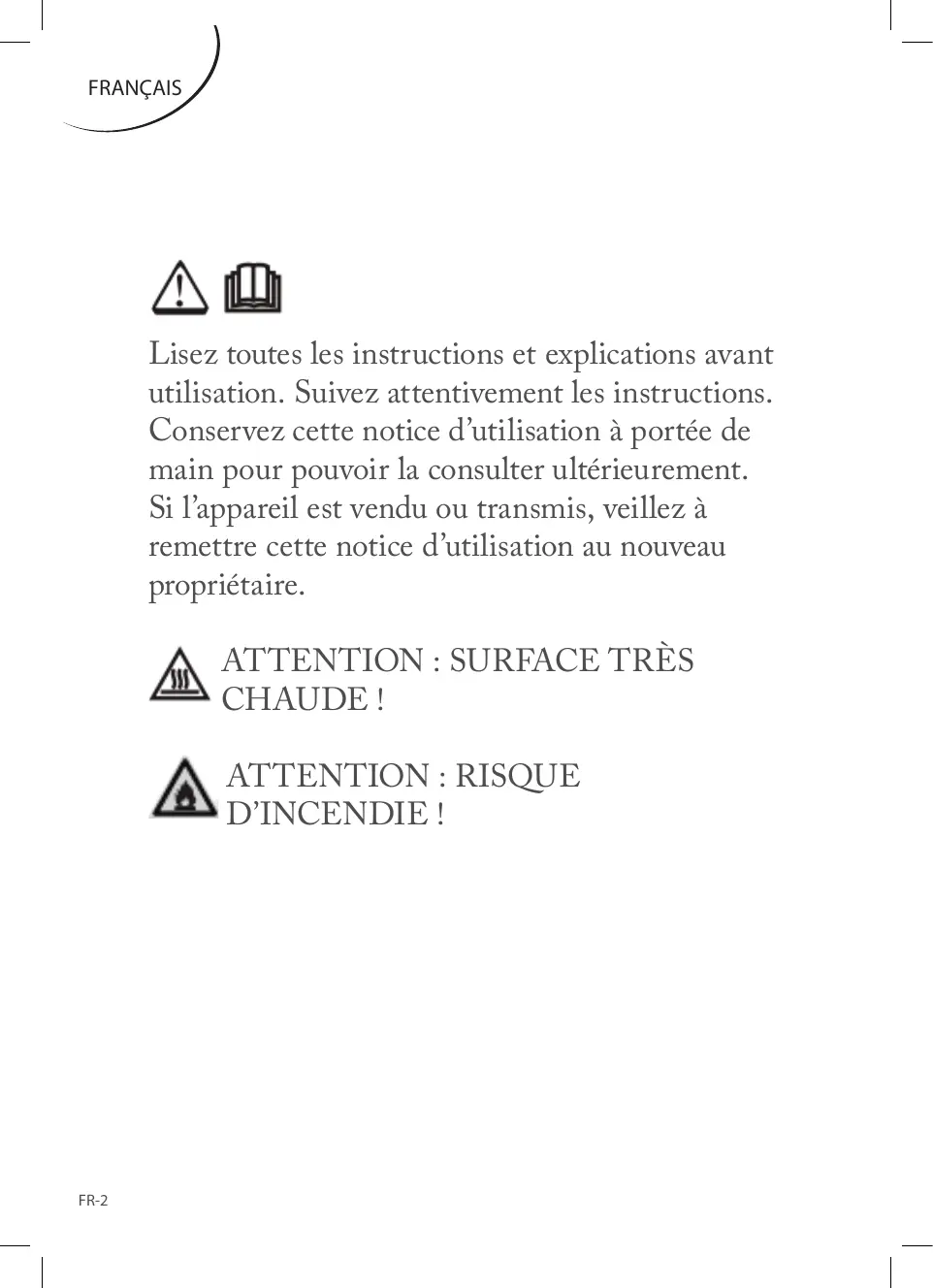 DÉPANNAGEFR-25 TECHNICAL SPECIFICATIONSFR-27 FICHE PRODUITFR-28 ENLÈVEMENT DES APPAREILS MÉNAGERS USAGÉS FR-30 FR-1 FRANÇAIS Lisez toutes les instructions et explications avant utilisation. Suivez attentivement les instructions. Conservez cette notice d’utilisation à portée de main pour pouvoir la consulter ultérieurement. Si l’appareil est vendu ou transmis, veillez à remettre cette notice d’utilisation au nouveau propriétaire.