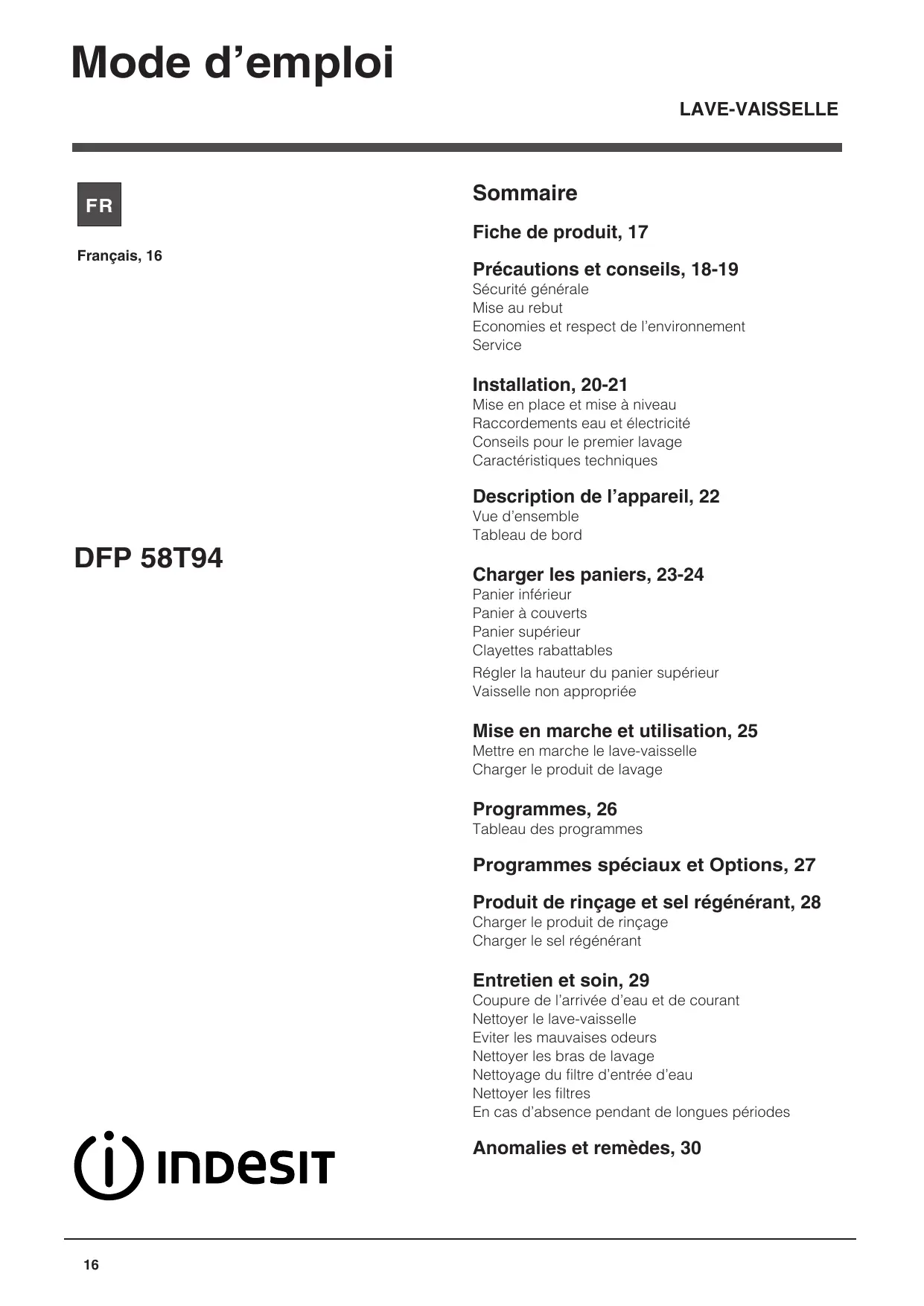 DFP58T94Z - Lave-vaisselle INDESIT - Notice d'utilisation et mode d'emploi gratuit