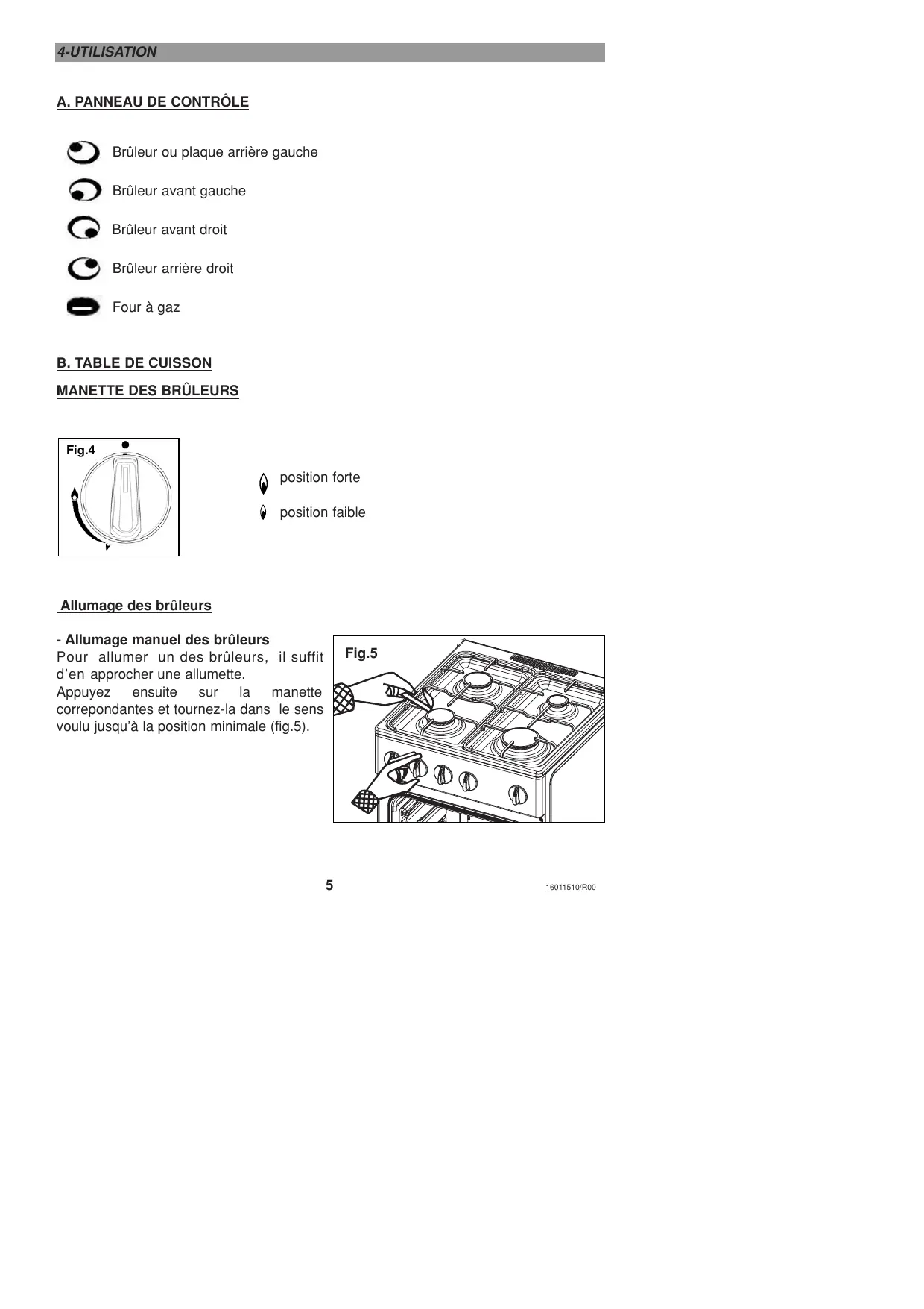 16011510/R00 - Allumage manuel des brûleurs avec sécurité coupe gaz (selon version) Pour allumer un des brûleurs, il suffit d’en approcher une allumette (fig.5). Appuyez ensuite sur la manette correpondantes et tournez-la dans le sens voulu jusqu’à la position désirée. Maintenez la manette enfoncée pendant 10 secondes après l’allumage. Assurez-vous que le brûleur soit bien allumé. Si le brûleur ne s’allume pas après 15 secondes ou si il s’éteint, ramenez la manette à la position « » . Attendez quelques minutes avant de le rallumer.