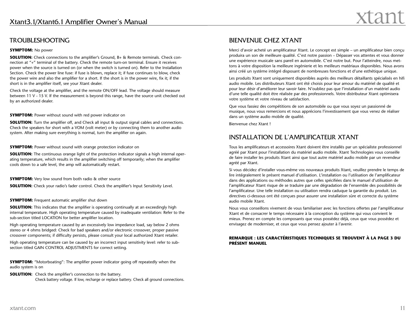 Tous les amplificateurs et accessoires Xtant doivent être installés par un spécialiste professionnel agréé par Xtant pour l’installation du matériel audio mobile. Xtant Technologies vous conseille de faire installer les produits Xtant ainsi que tout autre matériel audio mobile par un revendeur agréé par Xtant.
