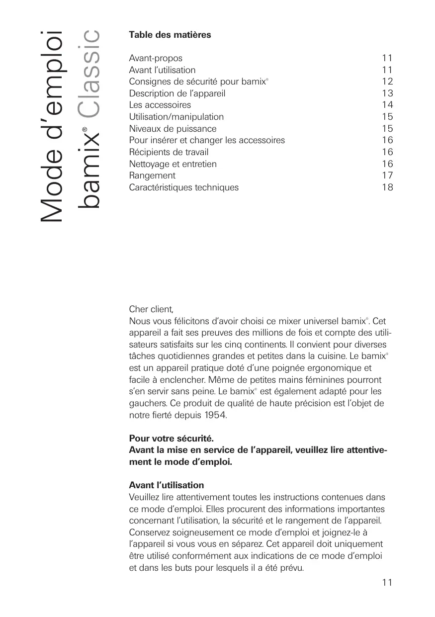 Cher client, Nous vous félicitons d’avoir choisi ce mixer universel bamix . Cet appareil a fait ses preuves des millions de fois et compte des utilisateurs satisfaits sur les cinq continents. Il convient pour diverses tâches quotidiennes grandes et petites dans la cuisine. Le bamix est un appareil pratique doté d’une poignée ergonomique et facile à enclencher. Même de petites mains féminines pourront s’en servir sans peine. Le bamix est également adapté pour les gauchers. Ce produit de qualité de haute précision est l’objet de notre fierté depuis 1954.