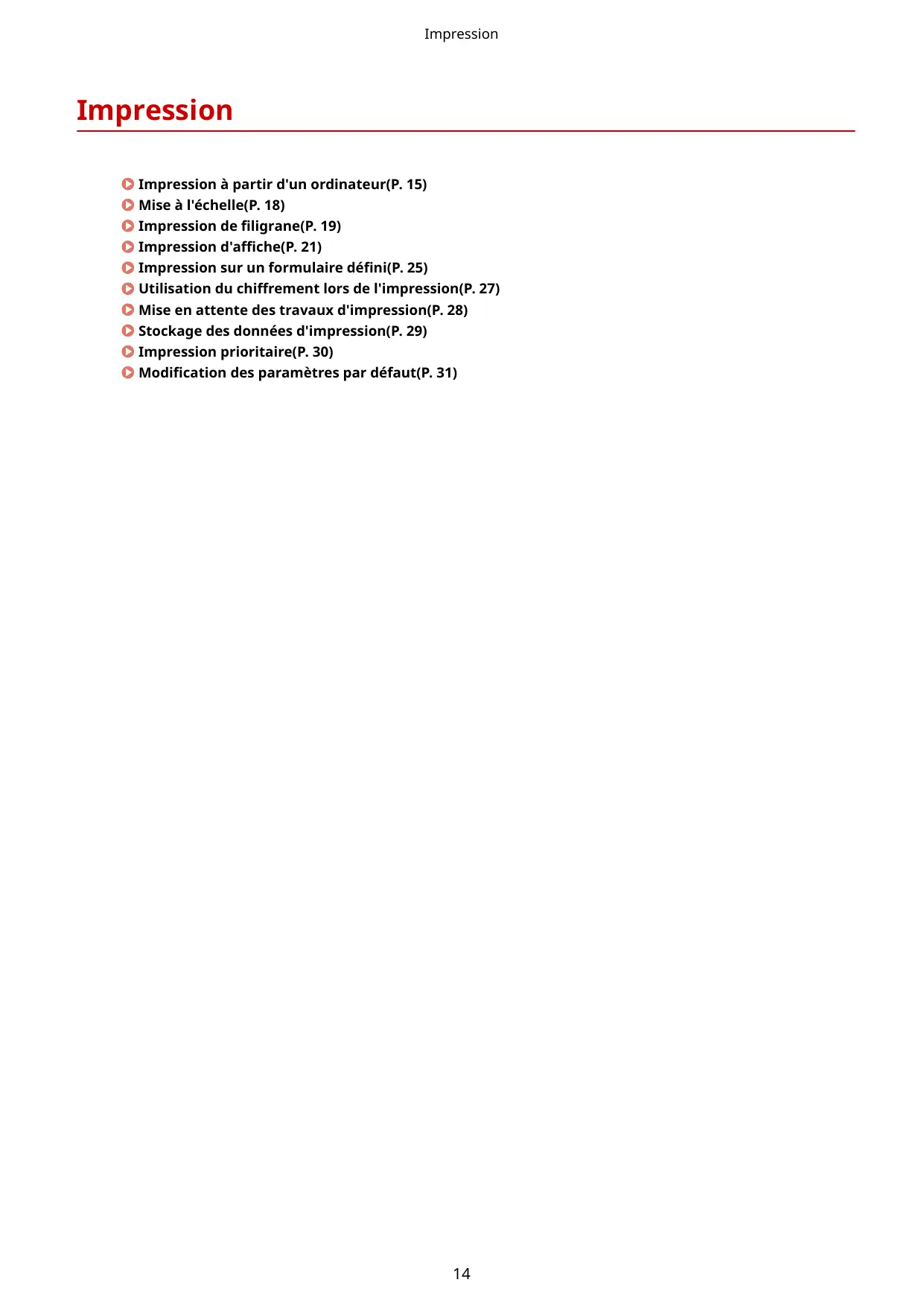 Impression Impression Impression à partir d'un ordinateur(P. 15) Mise à l'échelle(P. 18) Impression de filigrane(P. 19) Impression d'affiche(P. 21) Impression sur un formulaire défini(P. 25) Utilisation du chiffrement lors de l'impression(P. 27) Mise en attente des travaux d'impression(P. 28) Stockage des données d'impression(P. 29) Impression prioritaire(P. 30) Modification des paramètres par défaut(P. 31)