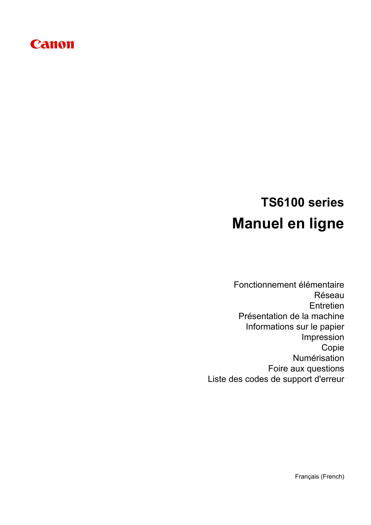 TS6100 series Manuel en ligne Fonctionnement élémentaire Réseau Entretien Présentation de la machine Informations sur le papier Impression Copie Numérisation Foire aux questions Liste des codes de support d'erreur Français (French) Contenu Utilisation du Manuel en ligne. . . . . . . . . . . . . . . . . . . . . . . . . . . . . . . . . . . . . . . 10 Symboles utilisés dans ce document. . . . . . . . . . . . . . . . . . . . . . . . . . . . . . . . . . . . . . . . . 11 Utilisateurs d'appareils tactiles (Windows). . . . . . . . . . . . . . . . . . . . . . . . . . . . . . . . . . . . . 12 Marques et licences. . . . . . . . . . . . . . . . . . . . . . . . . . . . . . . . . . . . . . . . . . . . . . . . . . . . . . 13 Fonctionnement élémentaire. . . . . . . . . . . . . . . . . . . . . . . . . . . . . . . . . . . . . . . . 24 Impression de photos à partir d'un ordinateur. . . . . . . . . . . . . . . . . . . . . . . . . . . . . . . . . .