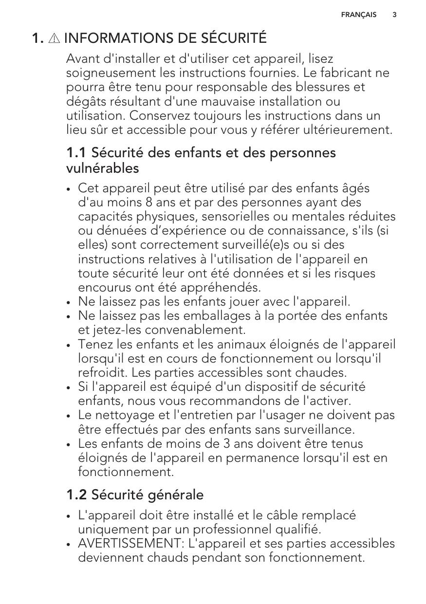 Cet appareil peut être utilisé par des enfants âgés d'au moins 8 ans et par des personnes ayant des capacités physiques, sensorielles ou mentales réduites ou dénuées d’expérience ou de connaissance, s'ils (si elles) sont correctement surveillé(e)s ou si des instructions relatives à l'utilisation de l'appareil en toute sécurité leur ont été données et si les risques encourus ont été appréhendés. Ne laissez pas les enfants jouer avec l'appareil. Ne laissez pas les emballages à la portée des enfants et jetez-les convenablement. Tenez les enfants et les animaux éloignés de l'appareil lorsqu'il est en cours de fonctionnement ou lorsqu'il refroidit. Les parties accessibles sont chaudes. Si l'appareil est équipé d'un dispositif de sécurité enfants, nous vous recommandons de l'activer. Le nettoyage et l'entretien par l'usager ne doivent pas être effectués par des enfants sans surveillance. Les enfants de moins de 3 ans doivent être tenus éloignés de l'appareil en permanence lorsqu'il est en fonctionnement.
