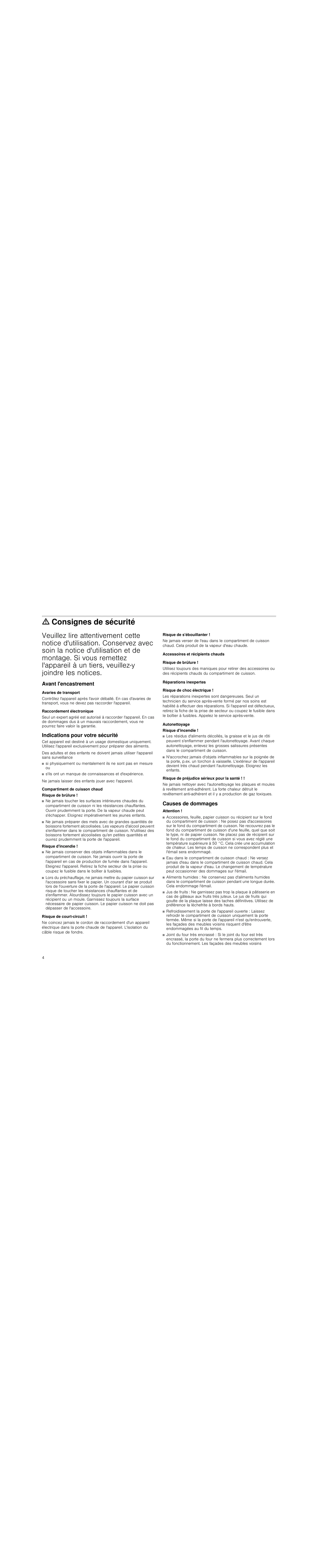 ã=Consignes de sécurité Veuillez lire attentivement cette notice d'utilisation. Conservez avec soin la notice d'utilisation et de montage. Si vous remettez l'appareil à un tiers, veuillez-y joindre les notices. Risque de s'ébouillanter ! Avant l'encastrement Réparations inexpertes Avaries de transport Contrôlez l'appareil après l'avoir déballé. En cas d'avaries de transport, vous ne devez pas raccorder l'appareil. Raccordement électronique Seul un expert agréé est autorisé à raccorder l'appareil. En cas de dommages dus à un mauvais raccordement, vous ne pourrez faire valoir la garantie. Indications pour votre sécurité Cet appareil est destiné à un usage domestique uniquement. Utilisez l'appareil exclusivement pour préparer des aliments. Des adultes et des enfants ne doivent jamais utiliser l'appareil sans surveillance