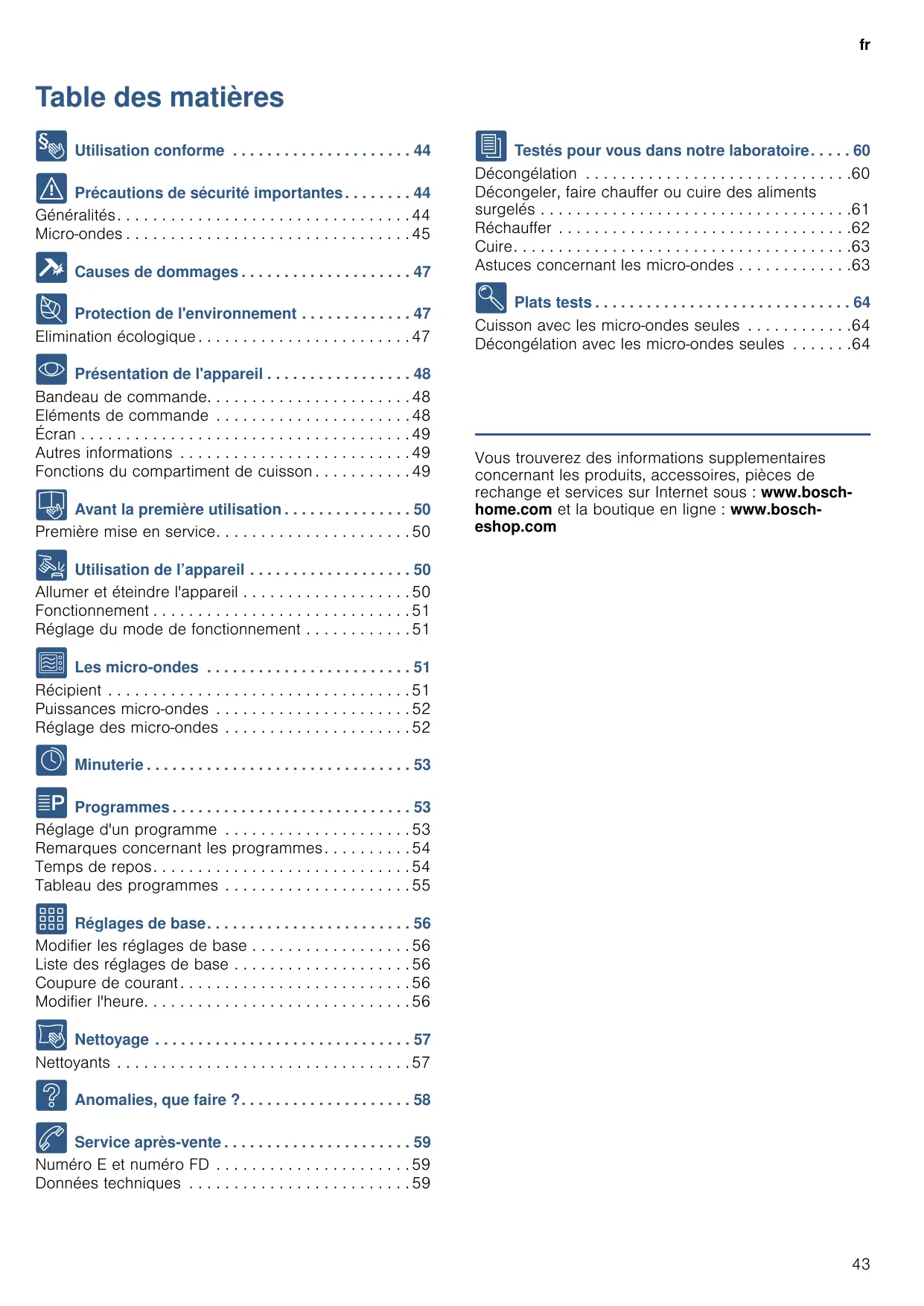 K Avant la première utilisation . . . . . . . . . . . . . . . 50 Première mise en service. . . . . . . . . . . . . . . . . . . . . . 50 Produktinfo Vous trouverez des informations supplementaires concernant les produits, accessoires, pièces de rechange et services sur Internet sous : www.boschhome.com et la boutique en ligne : www.boscheshop.com 1 Utilisation de l’appareil . . . . . . . . . . . . . . . . . . . 50 Allumer et éteindre l'appareil . . . . . . . . . . . . . . . . . . . 50 Fonctionnement . . . . . . . . . . . . . . . . . . . . . . . . . . . . . 51 Réglage du mode de fonctionnement . . . . . . . . . . . . 51 ^ Les micro-ondes . . . . . . . . . . . . . . . . . . . . . . . . 51 Récipient . . . . . . . . . . . . . . . . . . . . . . . . . . . . . . . . . . 51 Puissances micro-ondes . . . . . . . . . . . . . . . . . . . . . . 52 Réglage des micro-ondes . . . . . . . . . . . . . . . . . . . . . 52 O Minuterie . . . . . . . . . . . . . . . . . . . . . . . . . . . . . . . 53 P Programmes . . . . . . . . . . . . . . . . . . . . . . . . . . . . 53 Réglage d'un programme . . . . . . . . . . . . Remarques concernant les programmes . Temps de repos. . . . . . . . . . . . . . . . . . . . Tableau des programmes . . . . . . . . . . . .