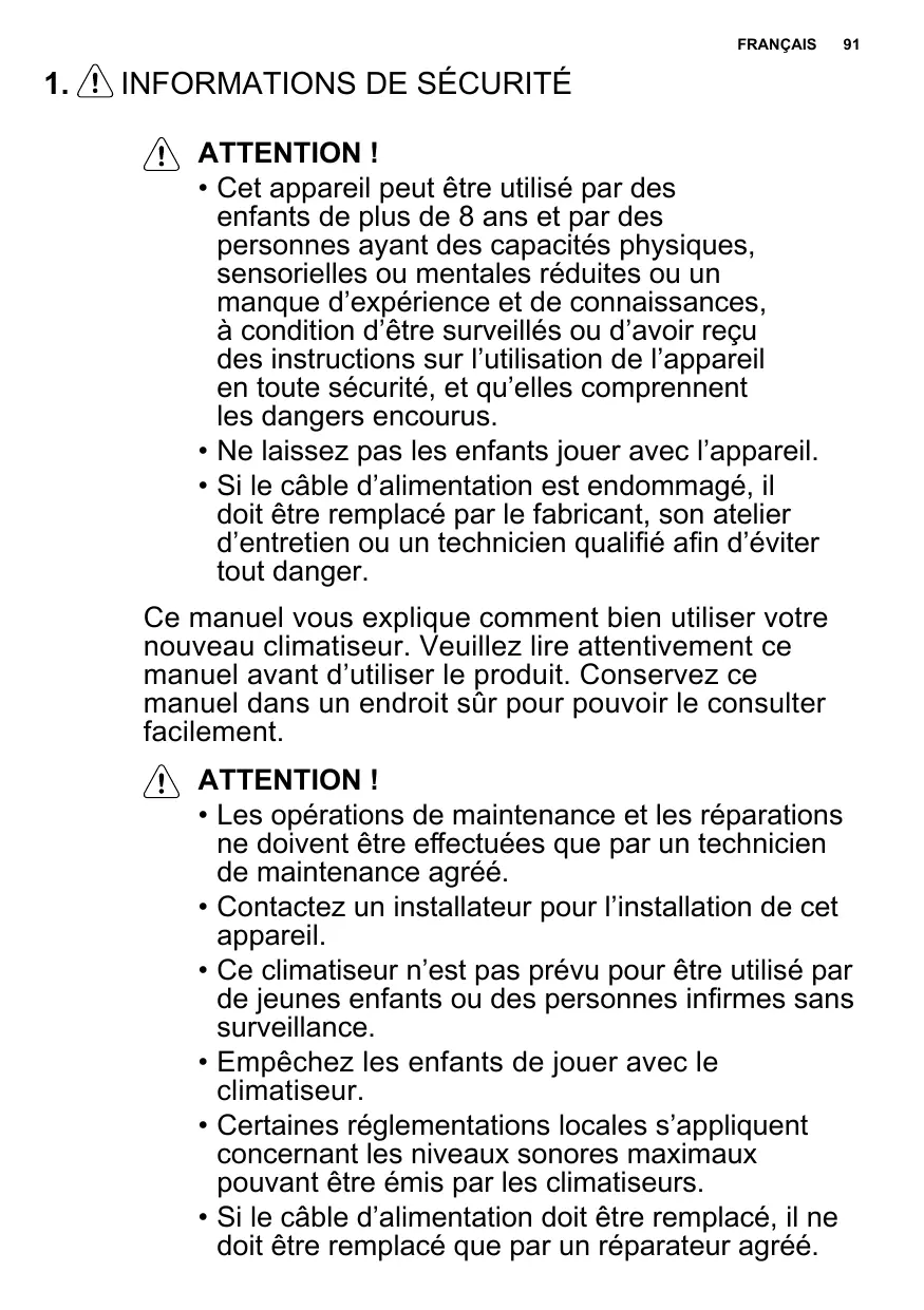 - Si le câble d’alimentation est endommagé, il doit être remplacé par le fabricant, son atelier d’entretien ou un technicien qualifié afin d’éviter tout danger. Ce manuel vous explique comment bien utiliser votre nouveau climatiseur. Veuillez lire attentivement ce manuel avant d’utiliser le produit. Conservez ce manuel dans un endroit sûr pour pouvoir le consulter facilement. ATTENTION !