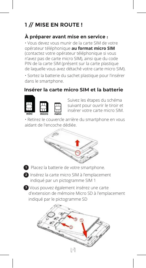 - Sortez la batterie du sachet plastique pour l'insérer dans le smartphone. Insérer la carte micro SIM et la batterie Suivez les étapes du schéma suivant pour ouvrir le tiroir et insérer votre carte micro SIM.
