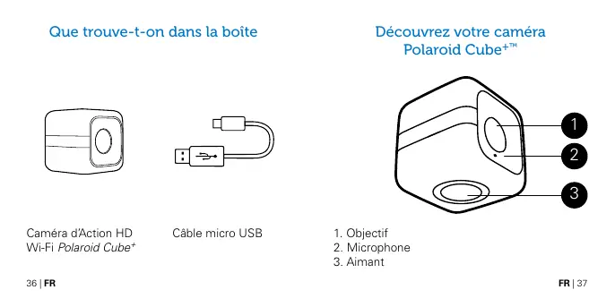 EN Hello and welcome to the Polaroid Cube+™ camera. Let’s get started. FR Bonjour et bienvenue dans l’univers de la caméra Polaroid Cube+™. Démarrons.