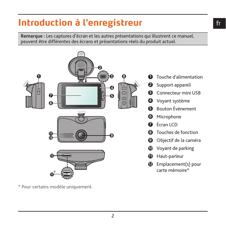 Appuyez et maintenez enfoncé pendant 2 secondes pour allumer ou éteindre l'enregistreur. Lorsque l'enregistreur est allumé, appuyez pour allumer ou éteindre l'écran LCD. Bouton Événement Appuyez pour démarrer manuellement un enregistrement d'urgence. Voyants DEL Voyant système S'éclaire en vert quand l'enregistreur est en cours de chargement. Pendant le chargement, la LED clignote alternativement en orange et en vert pendant que l'enregistrement est en cours. Voyant parking Clignote en rouge lorsque l'enregistrement de parking est en cours.