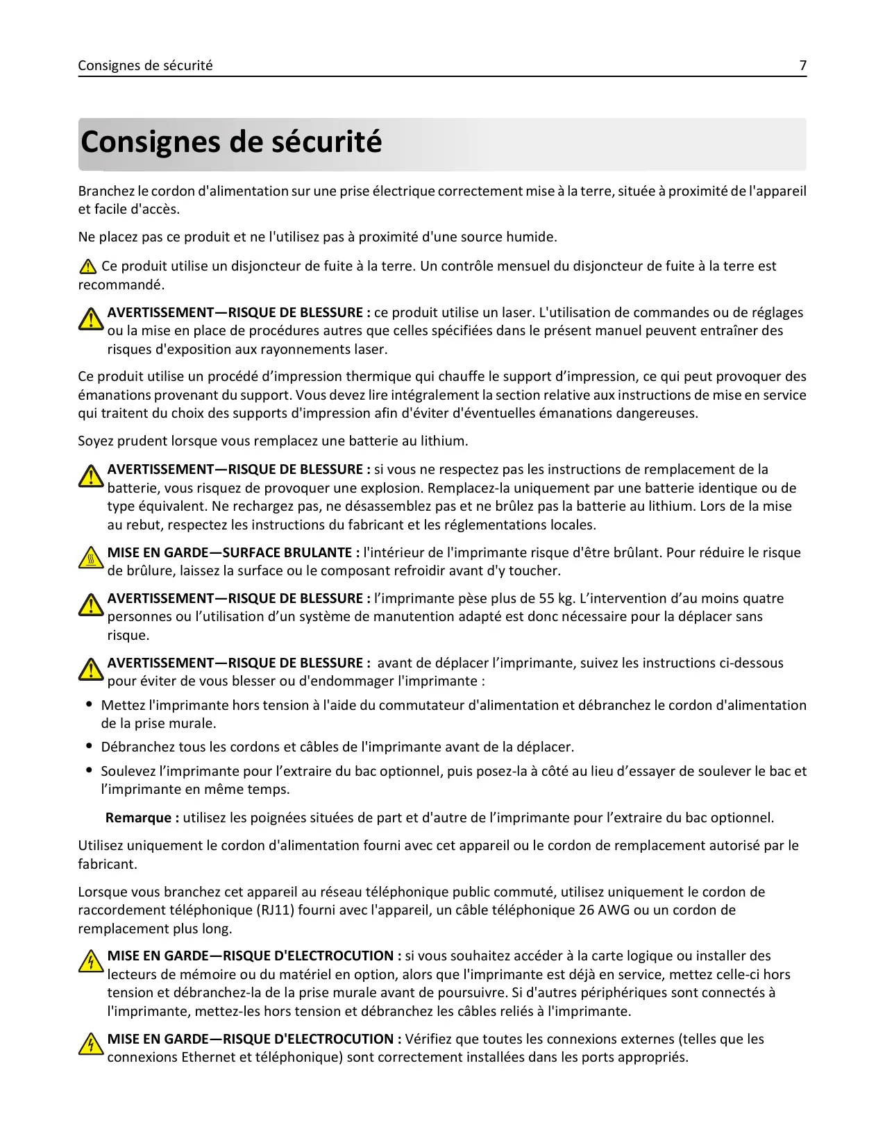 Consignes de sécurité Branchez le cordon d'alimentation sur une prise électrique correctement mise à la terre, située à proximité de l'appareil et facile d'accès. Ne placez pas ce produit et ne l'utilisez pas à proximité d'une source humide. Ce produit utilise un disjoncteur de fuite à la terre. Un contrôle mensuel du disjoncteur de fuite à la terre est recommandé. AVERTISSEMENT—RISQUE DE BLESSURE : ce produit utilise un laser. L'utilisation de commandes ou de réglages ou la mise en place de procédures autres que celles spécifiées dans le présent manuel peuvent entraîner des risques d'exposition aux rayonnements laser. Ce produit utilise un procédé d’impression thermique qui chauffe le support d’impression, ce qui peut provoquer des émanations provenant du support. Vous devez lire intégralement la section relative aux instructions de mise en service qui traitent du choix des supports d'impression afin d'éviter d'éventuelles émanations dangereuses. Soyez prudent lorsque vous remplacez une batterie au lithium. AVERTISSEMENT—RISQUE DE BLESSURE : si vous ne respectez pas les instructions de remplacement de la batterie, vous risquez de provoquer une explosion. Remplacez-la uniquement par une batterie identique ou de type équivalent. Ne rechargez pas, ne désassemblez pas et ne brûlez pas la batterie au lithium. Lors de la mise au rebut, respectez les instructions du fabricant et les réglementations locales. MISE EN GARDE—SURFACE BRULANTE : l'intérieur de l'imprimante risque d'être brûlant. Pour réduire le risque de brûlure, laissez la surface ou le composant refroidir avant d'y toucher. AVERTISSEMENT—RISQUE DE BLESSURE : l’imprimante pèse plus de 55 kg. L’intervention d’au moins quatre personnes ou l’utilisation d’un système de manutention adapté est donc nécessaire pour la déplacer sans risque. AVERTISSEMENT—RISQUE DE BLESSURE : avant de déplacer l’imprimante, suivez les instructions ci-dessous pour éviter de vous blesser ou d'endommager l'imprimante :