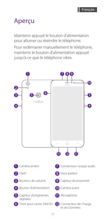 Aperçu Maintenir appuyé le bouton d'alimentation pour allumer ou éteindre le téléphone. Pour redémarrer manuellement le téléphone, maintenir le bouton d'alimentation appuyé jusqu'à ce que le téléphone vibre.
