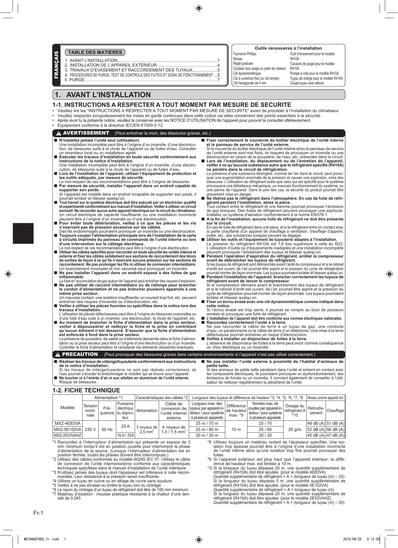 Modèle Caractéristiques des câbles *2 Alimentation *1 Puissance Câble de Tension Fréélectrique Alimentation connexion de nomiquence du disjoncl’unité interne/ nale teur externe 3 noyaux de 4 noyaux de 2,5 mm2 1,0 / 1,5 mm2 Longueur des tuyaux et différence de hauteur *3, *4, *5, *6, *7, *8 Longueur max. des Nombre max. de Différence Dosage du tuyaux par appareil incoudes par appareil inde hauteur réfrigérant A térieur / pour système térieur / pour système max. *9 *10 à plusieurs appareils à plusieurs appareils 25 m / 70 m 25 / 70 25 m / 80 m 15 m 25 / 80 20 g/m 20 m / 30 m 20 / 30 *1 Raccordez à l’interrupteur d’alimentation qui présente un espace de 3 mm minimum lorsqu’il est en position ouverte pour interrompre la phase d’alimentation de la source. (Lorsque l’interrupteur d’alimentation est en position fermée, toutes les phases doivent être interrompues.) *2 Utilisez des câbles conformes au modèle 60245 IEC 57. Utilisez le câble de connexion de l’unité interne/externe conforme aux caractéristiques techniques spécifiées dans le manuel d’installation de l’unité intérieure. *3 N’utilisez jamais des tuyaux dont l’épaisseur est inférieure à celle recommandée. Leur résistance à la pression serait insuffisante. *4 Utilisez un tuyau en cuivre ou en alliage de cuivre sans soudure. *5 Veillez à ne pas écraser ou tordre le tuyau lors du cintrage. *6 Le rayon du cintrage d’un tuyau de réfrigérant doit être de 100 mm minimum. *7 Matériau d’isolation : mousse plastique résistante à la chaleur d’une densité de 0,045 *8 U tilisez toujours un matériau isolant de l’épaisseur spécifiée. Une isolation trop épaisse pourrait être à l’origine d’une installation incorrecte de l’unité interne alors qu’une isolation trop fine pourrait provoquer des fuites. *9 Si l’appareil extérieur est plus haut que l’appareil intérieur, la différence de hauteur max. est limitée à 10 m. *10 Si la longueur du tuyau dépasse 25 m, une quantité supplémentaire de réfrigérant (R410A) doit être ajoutée. (pour le modèle 4E83VA) Quantité supplémentaire de réfrigérant = A × (longueur de tuyau (m) – 25) Si la longueur du tuyau dépasse 0 m, une quantité supplémentaire de réfrigérant (R410A) doit être ajoutée. (pour le modèle 5E102VA) Quantité supplémentaire de réfrigérant = A × longueur de tuyau (m) Si la longueur du tuyau dépasse 20 m, une quantité supplémentaire de réfrigérant (R410A) doit être ajoutée. (pour le modèle 2E53VAHZ) Quantité supplémentaire de réfrigérant = A × (longueur de tuyau (m) – 20) Fr-1 WG79A667H02_fr.indd