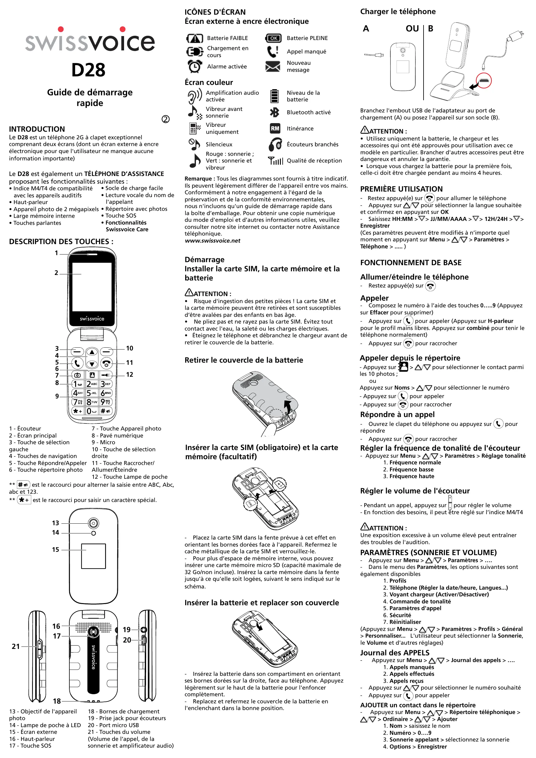 Amplification audio activée Niveau de la batterie Vibreur avant sonnerie Bluetooth activé Vibreur uniquement Itinérance Silencieux Écouteurs branchés Rouge : sonnerie ; Vert : sonnerie et vibreur Qualité de réception Remarque : Tous les diagrammes sont fournis à titre indicatif. Ils peuvent légèrement différer de l'appareil entre vos mains. Conformément à notre engagement à l'égard de la préservation et de la conformité environnementales, nous n'incluons qu'un guide de démarrage rapide dans la boîte d’emballage. Pour obtenir une copie numérique du mode d'emploi et d’autres informations utiles, veuillez consulter notre site internet ou contacter notre Assistance téléphonique. www.swissvoice.net Démarrage Installer la carte SIM, la carte mémoire et la batterie