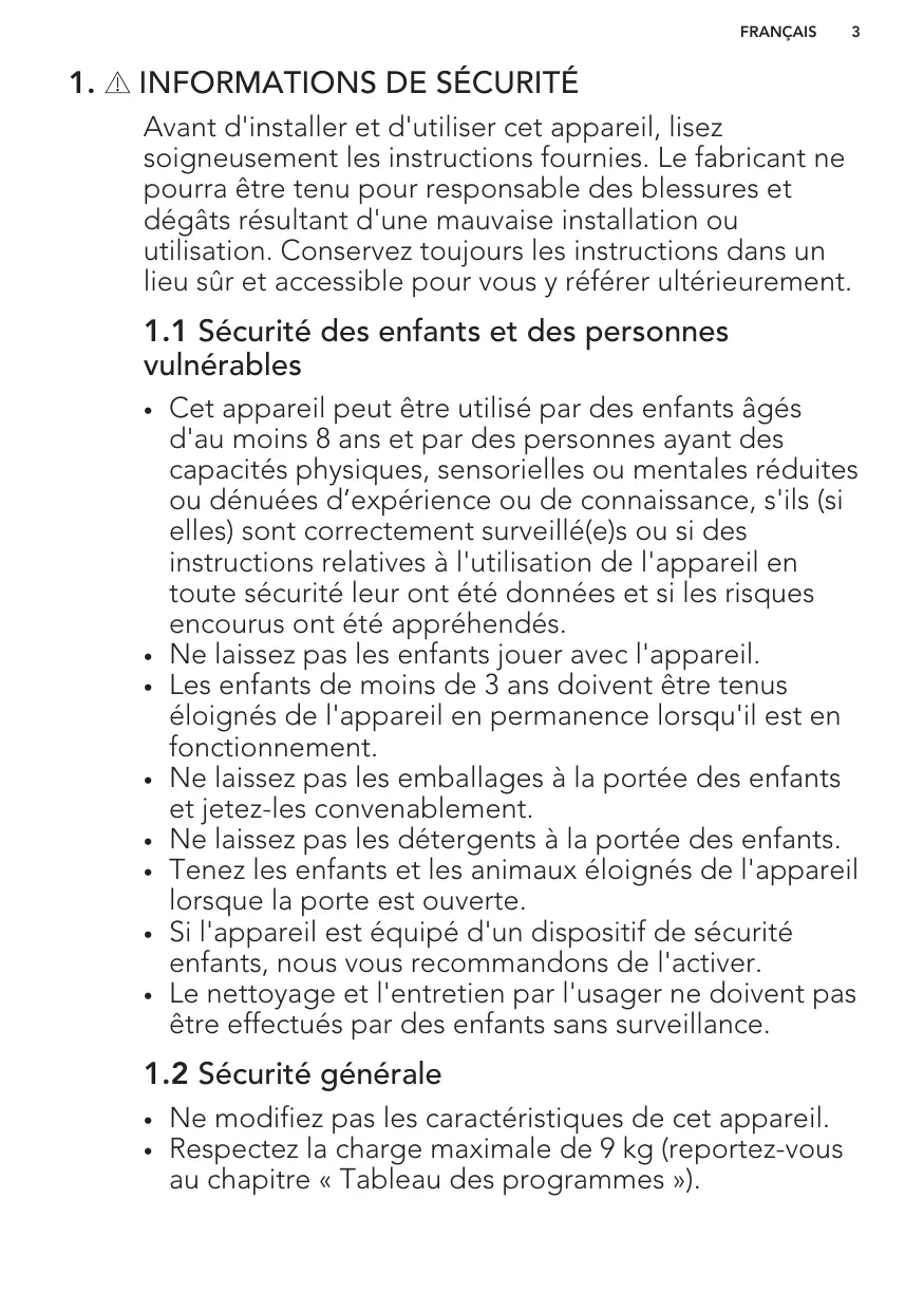 Cet appareil peut être utilisé par des enfants âgés d'au moins 8 ans et par des personnes ayant des capacités physiques, sensorielles ou mentales réduites ou dénuées d’expérience ou de connaissance, s'ils (si elles) sont correctement surveillé(e)s ou si des instructions relatives à l'utilisation de l'appareil en toute sécurité leur ont été données et si les risques encourus ont été appréhendés. Ne laissez pas les enfants jouer avec l'appareil. Les enfants de moins de 3 ans doivent être tenus éloignés de l'appareil en permanence lorsqu'il est en fonctionnement. Ne laissez pas les emballages à la portée des enfants et jetez-les convenablement. Ne laissez pas les détergents à la portée des enfants. Tenez les enfants et les animaux éloignés de l'appareil lorsque la porte est ouverte. Si l'appareil est équipé d'un dispositif de sécurité enfants, nous vous recommandons de l'activer. Le nettoyage et l'entretien par l'usager ne doivent pas être effectués par des enfants sans surveillance.