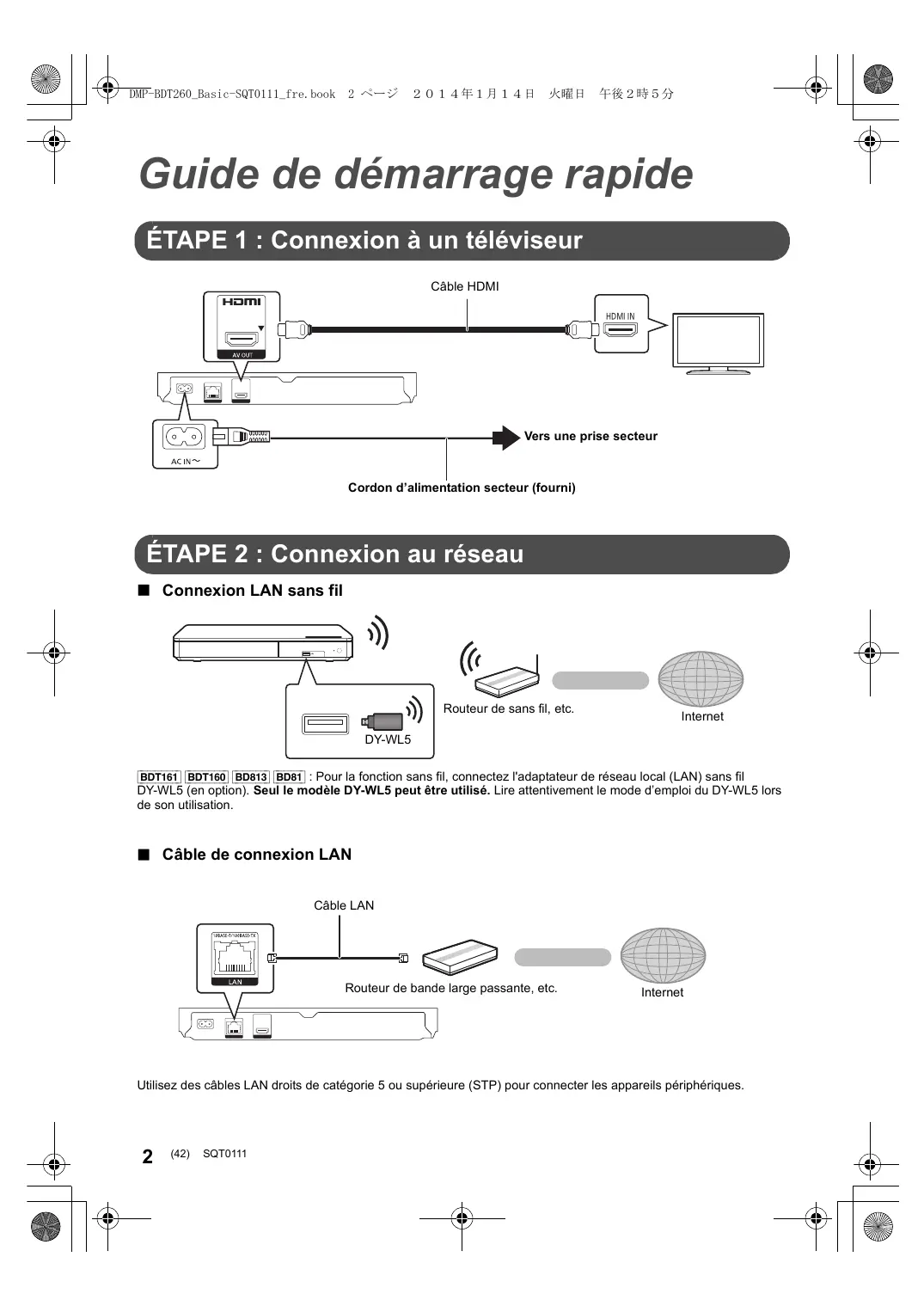 Mode d’emploi de base Lecteur de Blu-ray DiscTM “PCM”*2 BD-Video : 7.1Ch PCM*1 DVD-Video : 5.1Ch PCM AAC DTS® PCM FLAC Vorbis Guide de démarrage rapide ÉTAPE 1 : Connexion à un téléviseur Câble HDMI HDMI IN Vers une prise secteur Cordon d’alimentation secteur (fourni) ÉTAPE 2 : Connexion au réseau ∫ Connexion LAN sans fil Routeur de sans fil, etc. Internet DY-WL5 [BDT161] [BDT160] [BD813] [BD81] : Pour la fonction sans fil, connectez l'adaptateur de réseau local (LAN) sans fil DY-WL5 (en option). Seul le modèle DY-WL5 peut être utilisé. Lire attentivement le mode d’emploi du DY-WL5 lors de son utilisation. ∫ Câble de connexion LAN Câble LAN Routeur de bande large passante, etc. Internet Utilisez des câbles LAN droits de catégorie 5 ou supérieure (STP) pour connecter les appareils périphériques.
