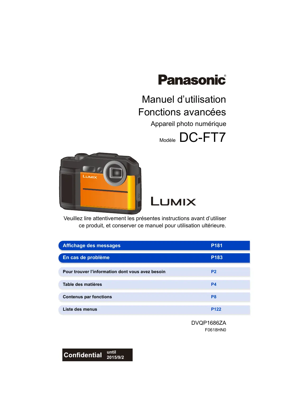 Manuel d’utilisation Fonctions avancées Appareil photo numérique Modèle DC-FT7 Veuillez lire attentivement les présentes instructions avant d’utiliser ce produit, et conserver ce manuel pour utilisation ultérieure. Affichage des messages P181 En cas de problème P183 Pour trouver l’information dont vous avez besoin
