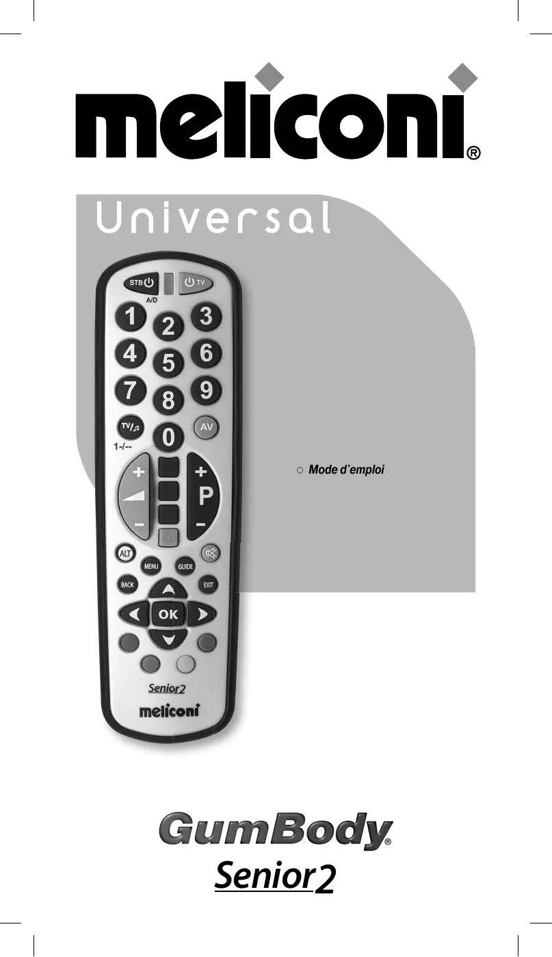 • Lisez attentivement ce mode d'emploi qui vous permettra de résoudre la plupart des problèmes. • Consultez notre site Internet www.meliconi.fr afin de trouver rapidement et facilement les informations que vous recherchez. • Si après avoir suivi les conseils de programmations vous rencontrez des difficultés, contactez le Service Assistance Téléphonique de Meliconi France. Internet : www.meliconi.fr E-mail : senior2@meliconi.fr • Afin que nous puissions vous renseigner au mieux vous devez connaître les éléments suivants : Marque et Modèle de l’appareil ainsi que la référence de sa télécommande d’origine. • En cas de besoin, pour faire valoir vos droits à notre garantie contractuelle de 2 ans, la télécommande doit nous être retournée, après notre accord, avec la facture d’achat ou le ticket de caisse mentionnant la date et le lieu d’achat. Les frais d’expédition du produit sont à la charge du client, le retour est pris en charge par MELICONI France. Toute mauvaise manipulation ou intervention sur la télécommande ainsi que la corrosion du circuit imprimé entraîne l’annulation de la garantie. Cachet du revendeur