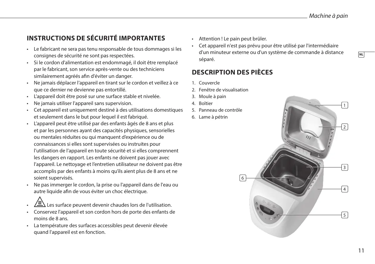 Attention ! Le pain peut brûler. Cet appareil n'est pas prévu pour être utilisé par l'intermédiaire d'un minuteur externe ou d'un système de commande à distance séparé.