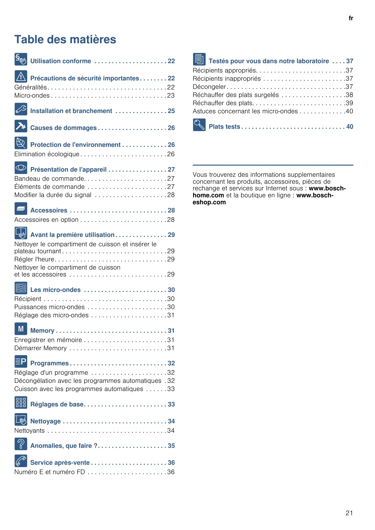 - Présentation de l'appareil . . . . . . . . . . . . . . . . . 27 Bandeau de commande. . . . . . . . . . . . . . . . . . . . . . . 27 Éléments de commande . . . . . . . . . . . . . . . . . . . . . . 27 Modifier la durée du signal . . . . . . . . . . . . . . . . . . . . 28 _ Accessoires . . . . . . . . . . . . . . . . . . . . . . . . . . . . 28 Produktinfo Vous trouverez des informations supplementaires concernant les produits, accessoires, pièces de rechange et services sur Internet sous : www.boschhome.com et la boutique en ligne : www.boscheshop.com Accessoires en option . . . . . . . . . . . . . . . . . . . . . . . . 28 K Avant la première utilisation . . . . . . . . . . . . . . . 29 Nettoyer le compartiment de cuisson et insérer le plateau tournant . . . . . . . . . . . . . . . . . . . . . . . . . . . . . 29 Régler l'heure. . . . . . . . . . . . . . . . . . . . . . . . . . . . . . . 29 Nettoyer le compartiment de cuisson et les accessoires . . . . . . . . . . . . . . . . . . . . . . . . . . . 29 ^ Les micro-ondes . . . . . . . . . . . . . . . . . . . . . . . . 30 Récipient . . . . . . . . . . . . . . . . . . . . . . . . . . . . . . . . . . 30 Puissances microondes . . . . . . . . . . . . . . . . . . . . . . 30 Réglage des micro-ondes . . . . . . . . . . . . . . . . . . . . . 31 B Memory . . . . . . . . . . . . . . . . . . . . . . . . . . . . . . . . 31 Enregistrer en mémoire . . . . . . . . . . . . . . . . . . . . . . . 31 Démarrer Memory . . . . . . . . . . . . . . . . . . . . . . . . . . . 31 P Programmes . . . . . . . . . . . . . . . . . . . . . . . . . . . . 32 Réglage d'un programme . . . . . . . . . . . . . . . . . . . . . 32 Décongélation avec les programmes automatiques . 32 Cuisson avec les programmes automatiques . . . . . . 33 Q Réglages de base. . . . . . . . . . . . . . . . . . . . . . . . 33 D Nettoyage . . . . . . . . . . . . . . . . . . . . . . . . . . . . . . 34 Nettoyants . . . . . . . . . . . . . . . . . . . . . . . . . . . . . . . . . 34 3 Anomalies, que faire ?. . . . . . . . . . . . . . . . . . . . 35 4 Service après-vente . . . . . . . . . . . . . . . . . . . . . . 36 Numéro E et numéro FD . . . . . . . . . . . . . . . . . . . . . . 36