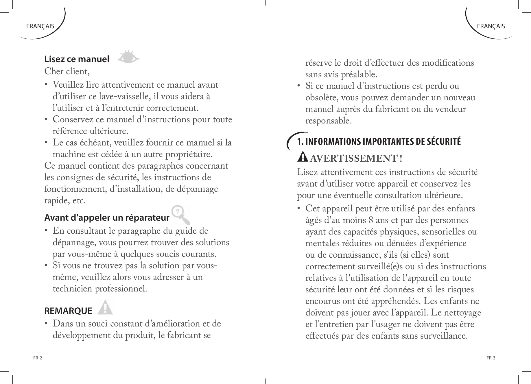 ENLÈVEMENT DES APPAREILS MÉNAGERS USAGÉS FR-85 FR-1 FRANÇAIS Lisez ce manuel Cher client,
