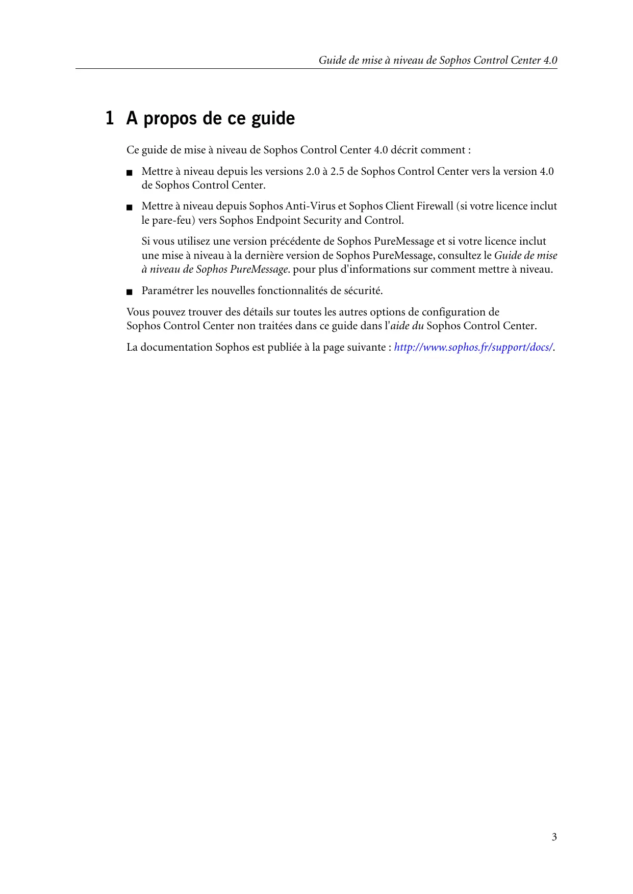 1 A propos de ce guide3 2 Nouveautés de Sophos Control Center 4.04 3 Configuration requise5 4 Préparation à la mise à niveau6 5 Mise à niveau du Sophos Control Center8 6 Vérification de la protection des ordinateurs9 7 Configuration du pare-feu10 8 Paramétrage du contrôle des applications11 9 Paramétrage du contrôle des périphériques13 10 Support technique16 11 Copyright17
