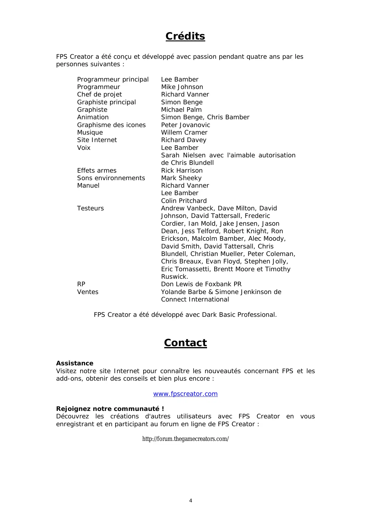 Ventes Lee Bamber Mike Johnson Richard Vanner Simon Benge Michael Palm Simon Benge, Chris Bamber Peter Jovanovic Willem Cramer Richard Davey Lee Bamber Sarah Nielsen avec l'aimable autorisation de Chris Blundell Rick Harrison Mark Sheeky Richard Vanner Lee Bamber Colin Pritchard Andrew Vanbeck, Dave Milton, David Johnson, David Tattersall, Frederic Cordier, Ian Mold, Jake Jensen, Jason Dean, Jess Telford, Robert Knight, Ron Erickson, Malcolm Bamber, Alec Moody, David Smith, David Tattersall, Chris Blundell, Christian Mueller, Peter Coleman, Chris Breaux, Evan Floyd, Stephen Jolly, Eric Tomassetti, Brentt Moore et Timothy Ruswick. Don Lewis de Foxbank PR Yolande Barbe & Simone Jenkinson de Connect International FPS Creator a été développé avec Dark Basic Professional. Contact Assistance Visitez notre site Internet pour connaître les nouveautés concernant FPS et les add-ons, obtenir des conseils et bien plus encore : www.fpscreator.com Rejoignez notre communauté ! Découvrez les créations d'autres utilisateurs avec FPS Creator enregistrant et en participant au forum en ligne de FPS Creator : http://forum.thegamecreators.com/