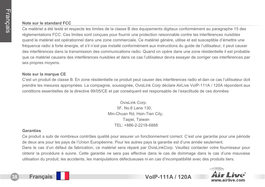 Français Note sur le standard FCC Ce matériel a été testé et respecte les limites de la classe B des équipements digitaux conformément au paragraphe 15 des réglementations FCC. Ces limites sont conçues pour fournir une protection raisonnable contre les interférences nuisibles quand le matériel est opérationnel dans une zone commerciale. Ce matériel génère, utilise et est susceptible d’émettre une fréquence radio à forte énergie, et s’il n’est pas installé conformément aux instructions du guide de l’utilisateur, il peut causer des interférences dans la transmission des communications radio. Quand on opère dans une zone résidentielle il est probable que ce matériel causera des interférences nuisibles et dans ce cas l’utilisateur devra essayer de corriger ces interférences par ses propres moyens. Note sur la marque CE C’est un produit de classe B. En zone résidentielle ce produit peut causer des interférences radio et dan ce cas l’utilisateur doit prendre les mesures appropriées. La compagnie, soussignée, OvisLink Corp déclare AirLive VoIP-111A / 120A répondent aux conditions essentielles de la directive 99/05/CE et par conséquent est responsable de l’exactitude de ces données OvisLink Corp. 5F, No.6 Lane 130, Min-Chuan Rd, Hsin-Tien City, Taipei, Taiwan
