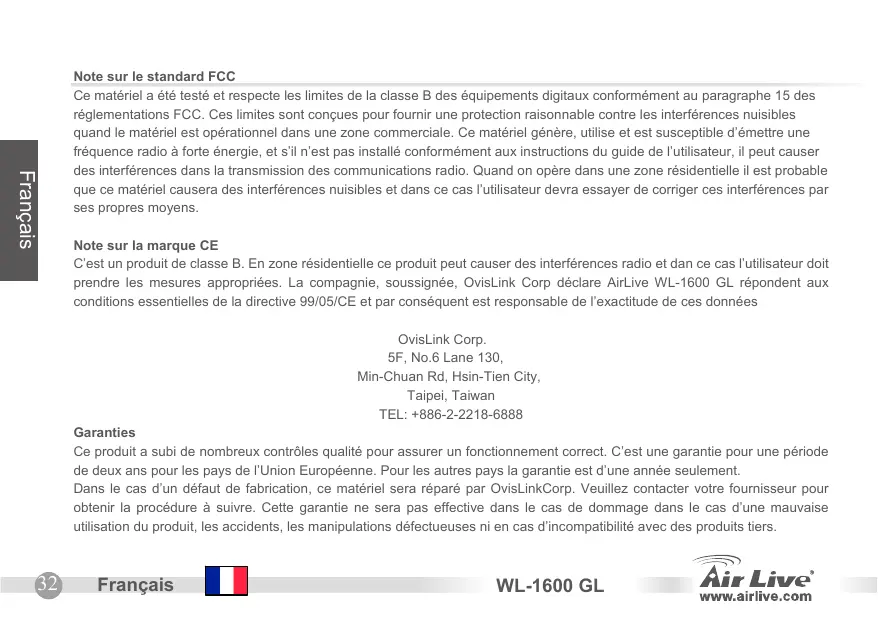 Anténa WAN LAN Reset Note sur le standard FCC Ce matériel a été testé et respecte les limites de la classe B des équipements digitaux conformément au paragraphe 15 des réglementations FCC. Ces limites sont conçues pour fournir une protection raisonnable contre les interférences nuisibles quand le matériel est opérationnel dans une zone commerciale. Ce matériel génère, utilise et est susceptible d’émettre une fréquence radio à forte énergie, et s’il n’est pas installé conformément aux instructions du guide de l’utilisateur, il peut causer des interférences dans la transmission des communications radio. Quand on opère dans une zone résidentielle il est probable que ce matériel causera des interférences nuisibles et dans ce cas l’utilisateur devra essayer de corriger ces interférences par ses propres moyens. Note sur la marque CE C’est un produit de classe B. En zone résidentielle ce produit peut causer des interférences radio et dan ce cas l’utilisateur doit prendre les mesures appropriées. La compagnie, soussignée, OvisLink Corp déclare AirLive WL-1600 GL répondent aux conditions essentielles de la directive 99/05/CE et par conséquent est responsable de l’exactitude de ces données OvisLink Corp. 5F, No.6 Lane 130, Min-Chuan Rd, Hsin-Tien City, Taipei, Taiwan