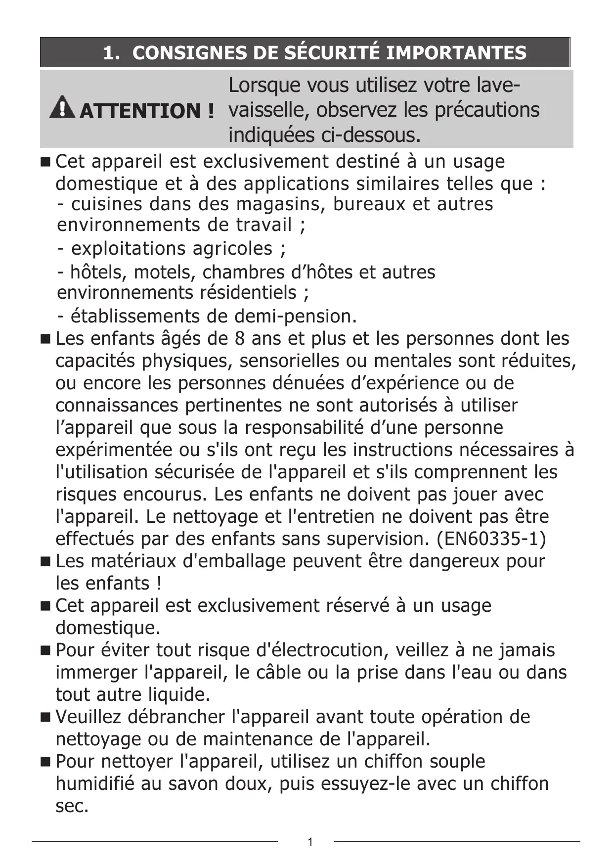 Lorsque vous utilisez votre laveATTENTION ! vaisselle, observez les précautions indiquées ci-dessous. n Cet appareil est exclusivement destiné à un usage domestique et à des applications similaires telles que : - cuisines dans des magasins, bureaux et autres environnements de travail ; - exploitations agricoles ; - hôtels, motels, chambres d’hôtes et autres environnements résidentiels ; - établissements de demi-pension. n Les enfants âgés de 8 ans et plus et les personnes dont les capacités physiques, sensorielles ou mentales sont réduites, ou encore les personnes dénuées d’expérience ou de connaissances pertinentes ne sont autorisés à utiliser l’appareil que sous la responsabilité d’une personne expérimentée ou s'ils ont reçu les instructions nécessaires à l'utilisation sécurisée de l'appareil et s'ils comprennent les risques encourus. Les enfants ne doivent pas jouer avec l'appareil. Le nettoyage et l'entretien ne doivent pas être effectués par des enfants sans supervision. (EN60335-1) n Les matériaux d'emballage peuvent être dangereux pour les enfants ! n Cet appareil est exclusivement réservé à un usage domestique. n Pour éviter tout risque d'électrocution, veillez à ne jamais immerger l'appareil, le câble ou la prise dans l'eau ou dans tout autre liquide. n Veuillez débrancher l'appareil avant toute opération de nettoyage ou de maintenance de l'appareil. n Pour nettoyer l'appareil, utilisez un chiffon souple humidifié au savon doux, puis essuyez-le avec un chiffon sec.