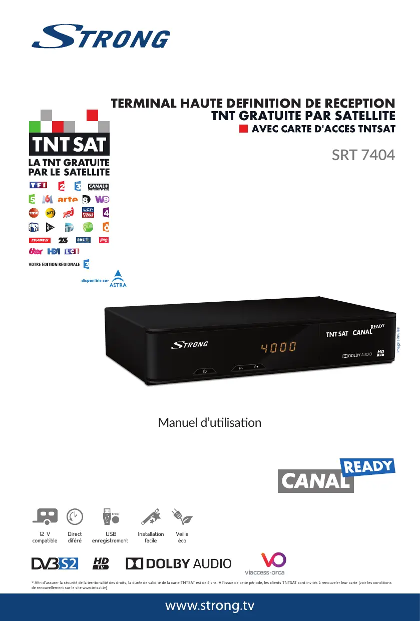 Vous trouverez dans cet emballage une carte d’accès Viaccess nécessaire à la réception des émissions. Les droits d’accès de la carte TNTSAT s’activent automatiquement à la première insertion de la carte dans le terminal, pour une durée de 48 mois. Il est recommandé de réaliser cette activation avant la date limite d’initialisation de la carte. La carte d’accès TNTSAT, tout comme le terminal STRONG SRT 7404, sont garantis 24 mois à partir de la date d’achat chez votre distributeur, en application de nos consignes de sécurité notifiées en page 2 du manuel. Si vous rencontrez des difficultés lors de l’installation ou lors de la mise en service de votre terminal, veuillez contacter: SFS au: 0826 029 928 (coût de l’appel: 0,15€ par minute) Une assistance répondra à vos questions. Si l’assistance téléphonique détermine la défectuosité du produit, SFS vous communiquera la procédure à suivre. SFS 150 rue de la Pierre D’Angeroux 74800 la Roche sur Foron France La durée de validité de la carte TNTSAT est de 4 ans. Voir conditions de renouvellement au terme de ces 4 ans sur le site www.tntsat.tv Utilisation d’un décodeur et d’une carte TNTSAT exclusivement limitée au Territoire Français Métropolitain et Monaco, au profit de personnes physiques, pour un usage privé et personnel.
