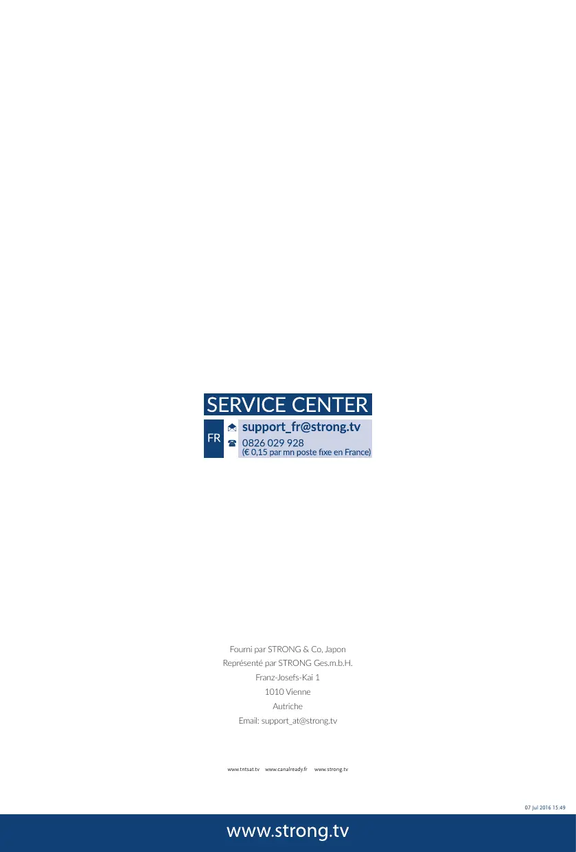 Fourni par STRONG & Co, Japon Représenté par STRONG Ges.m.b.H. Franz-Josefs-Kai 1 1010 Vienne Autriche Email: support_at@strong.tv www.tntsat.tv www.canalready.fr www.strong.tv 07 Jul 2016 15:49 Table des matières