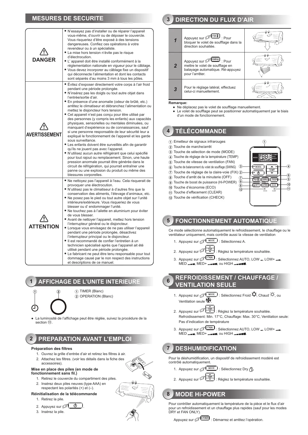 Touche de marche/arrêt Touche de sélection de mode (MODE) Touche de réglage de la température (TEMP) Touche de vitesse de ventilation (FAN) Touche de balancement du volet de soufflage (SWING) 3 Touche de réglage de la claire-voie (FIX) 2 Touche d’arrêt de la minuterie (OFF) 7 Touche de boost de puissance (Hi-POWER) 9 8 Touche d’économie (ECO) # Touche d’effacement (CLEAR) Touche de vérification (CHECK)