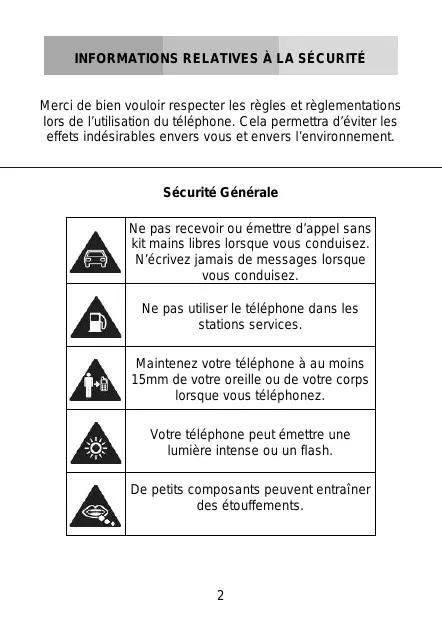 Ne pas recevoir ou émettre d’appel sans kit mains libres lorsque vous conduisez. N’écrivez jamais de messages lorsque vous conduisez. Ne pas utiliser le téléphone dans les stations services. Maintenez votre téléphone à au moins 15mm de votre oreille ou de votre corps lorsque vous téléphonez. Votre téléphone peut émettre une lumière intense ou un flash. De petits composants peuvent entraîner des étouffements.