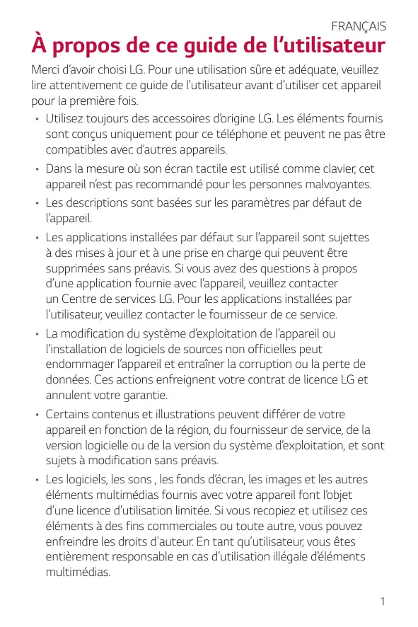 À propos de ce guide de l’utilisateur Merci d’avoir choisi LG. Pour une utilisation sûre et adéquate, veuillez lire attentivement ce guide de l’utilisateur avant d’utiliser cet appareil pour la première fois. • Utilisez toujours des accessoires d’origine LG. Les éléments fournis sont conçus uniquement pour ce téléphone et peuvent ne pas être compatibles avec d’autres appareils. • Dans la mesure où son écran tactile est utilisé comme clavier, cet appareil n’est pas recommandé pour les personnes malvoyantes. • Les descriptions sont basées sur les paramètres par défaut de l’appareil. • Les applications installées par défaut sur l’appareil sont sujettes à des mises à jour et à une prise en charge qui peuvent être supprimées sans préavis. Si vous avez des questions à propos d’une application fournie avec l’appareil, veuillez contacter un Centre de services LG. Pour les applications installées par l’utilisateur, veuillez contacter le fournisseur de ce service. • La modification du système d’exploitation de l’appareil ou l’installation de logiciels de sources non officielles peut endommager l’appareil et entraîner la corruption ou la perte de données. Ces actions enfreignent votre contrat de licence LG et annulent votre garantie. • Certains contenus et illustrations peuvent différer de votre appareil en fonction de la région, du fournisseur de service, de la version logicielle ou de la version du système d’exploitation, et sont sujets à modification sans préavis. • Les logiciels, les sons , les fonds d’écran, les images et les autres éléments multimédias fournis avec votre appareil font l’objet d’une licence d’utilisation limitée. Si vous recopiez et utilisez ces éléments à des fins commerciales ou toute autre, vous pouvez enfreindre les droits d'auteur. En tant qu’utilisateur, vous êtes entièrement responsable en cas d’utilisation illégale d’éléments multimédias. 1