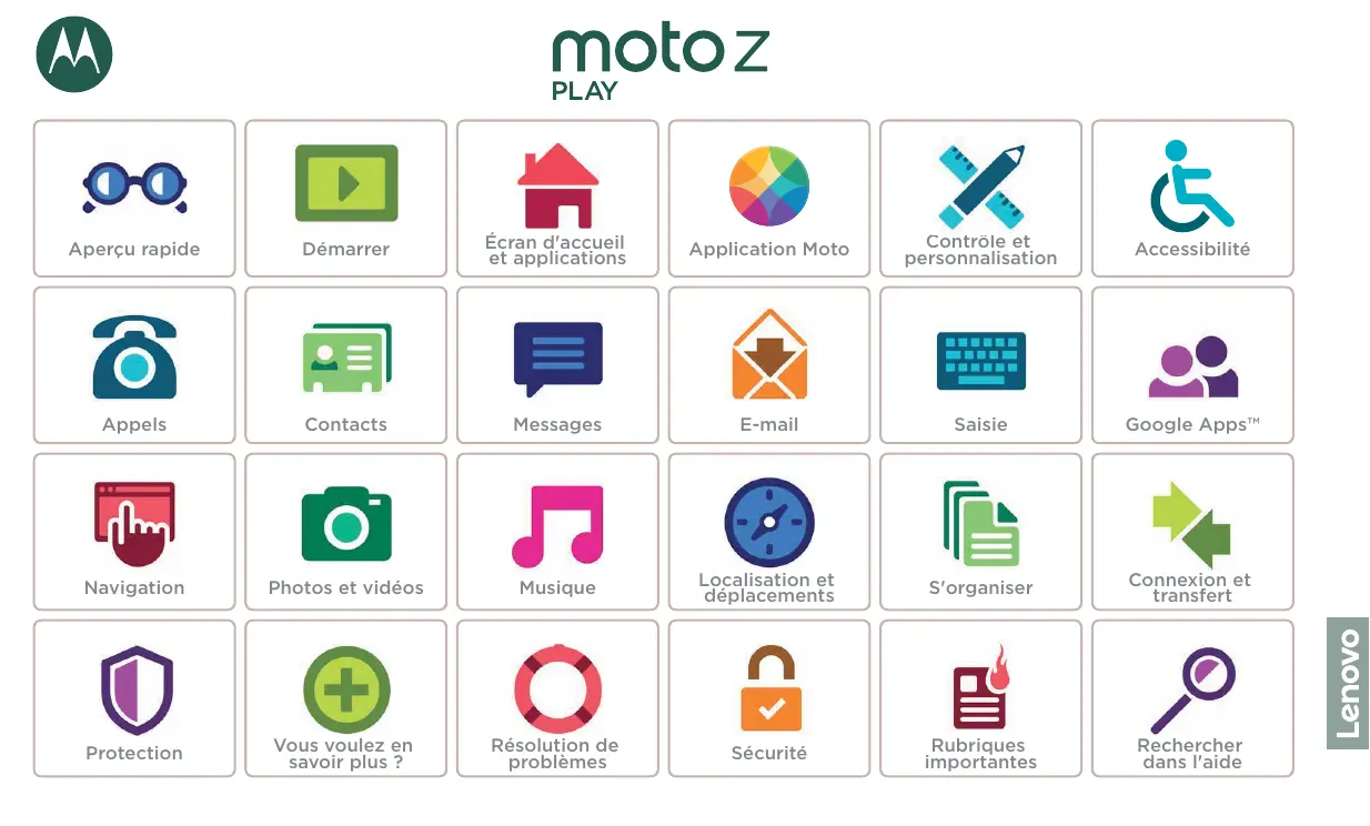 Obtenez des réponses, des mises à jour et des infos : • L'aide se trouve ici : appuyez sur Applications > Aide pour accéder à des tutoriels, des guides détaillés et des FAQ directement depuis votre téléphone. • Tout Moto Z : accédez à des logiciels, des guides de l'utilisateur et plus encore à l'adresse www.motorola.com/mymotoz. • Moto Mods : découvrez l'étendue des possibilités à l'adresse www.motorola.com/mymotomods. • Obtenir des applications : appuyez sur Applications Play Store pour acheter et télécharger des applications.