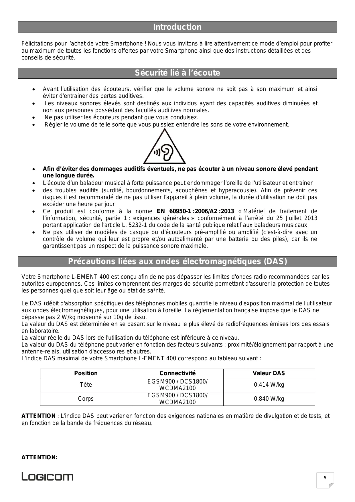 0700 ème – 75008 Paris) Nous, LOGICOM (Logicom – 55 rue de Lisbonne – Paris 8 Déclarons que le produit Smartphone LOGICOM L-EMENT 400 est en conformité avec les exigences essentielles de la Directive R&TTE 1999/05/CE applicables aux normes Européennes suivantes :