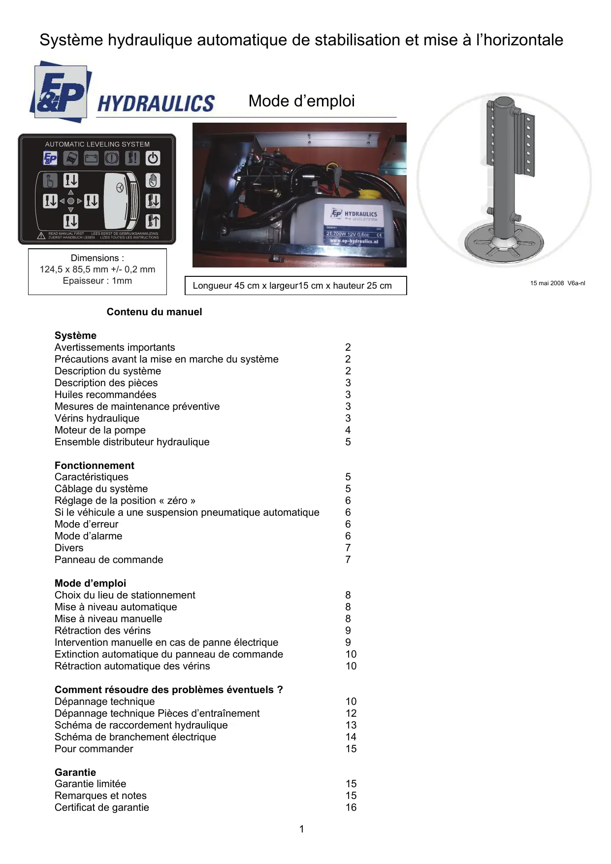 Système hydraulique automatique de stabilisation et mise à l’horizontale Mode d’emploi Dimensions : 124,5 x 85,5 mm +/- 0,2 mm Epaisseur : 1mm 15 mai 2008 V6a-nl Longueur 45 cm x largeur15 cm x hauteur 25 cm Contenu du manuel