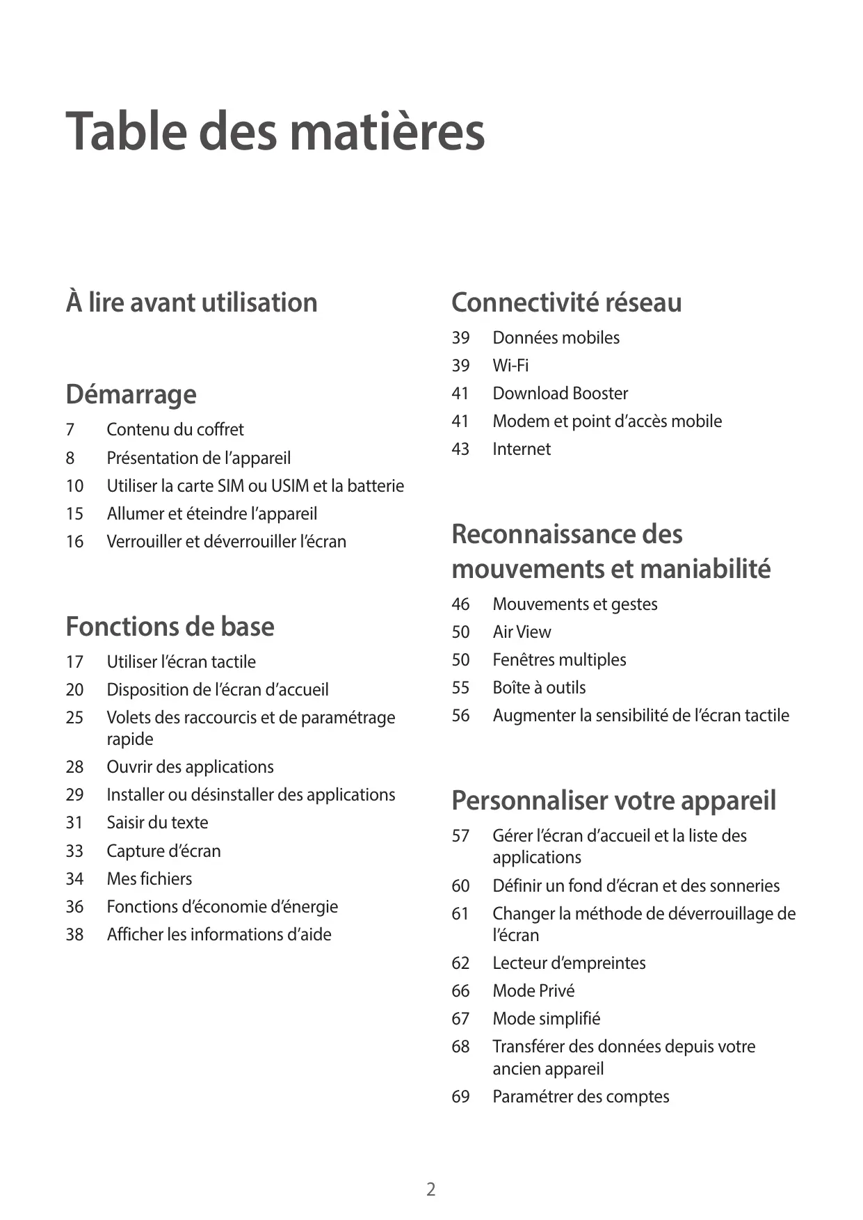 Contenu du coffret Présentation de l’appareil Utiliser la carte SIM ou USIM et la batterie Allumer et éteindre l’appareil Verrouiller et déverrouiller l’écran Reconnaissance des mouvements et maniabilité