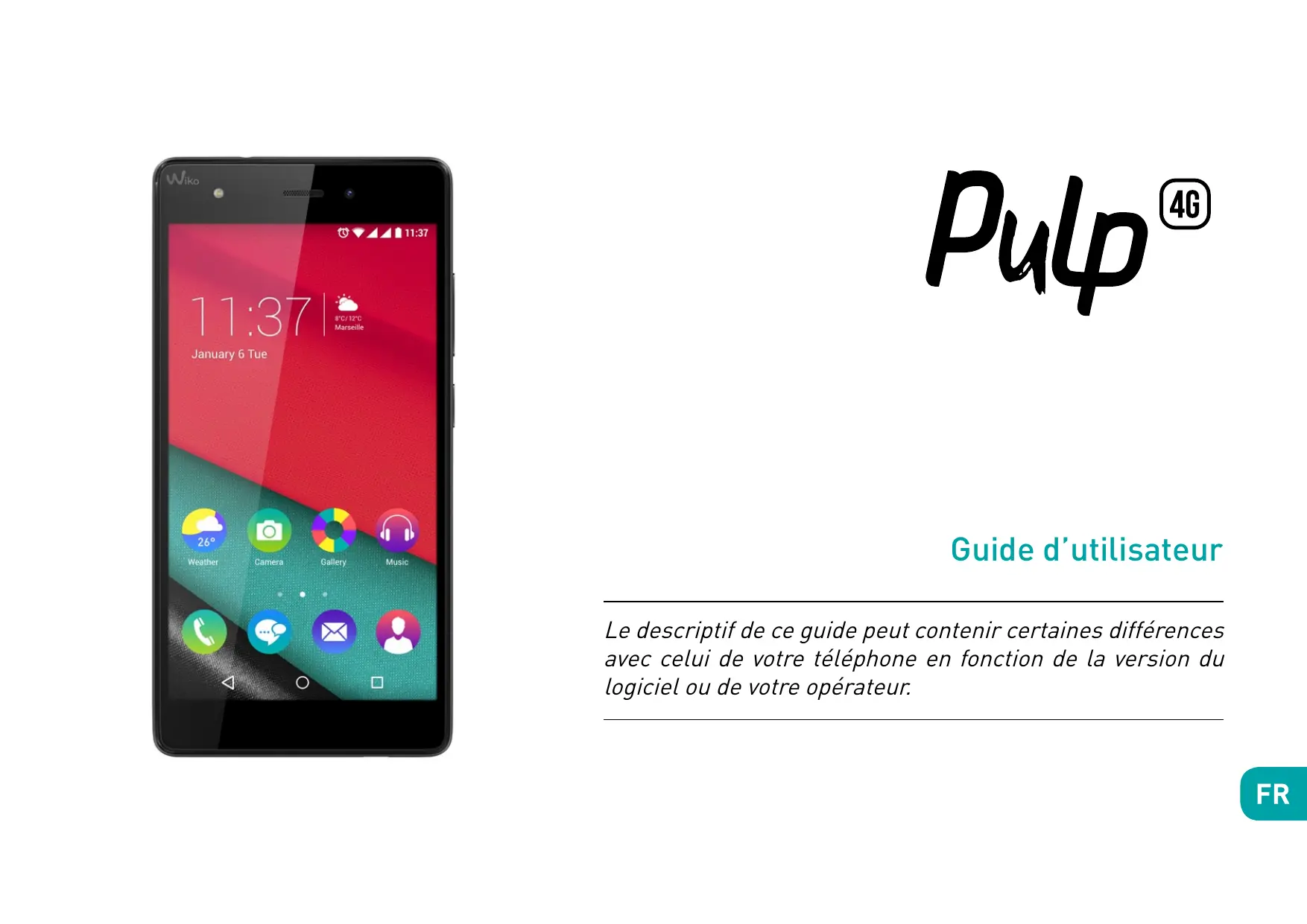 We, WIKO SAS - 1, rue Capitaine Dessemond - 13007 - Marseille - FRANCE, here by declare that the PULP 4G mobile phone complies with the standards and provisions of the Directives. SAFE T Y : EN 60950-1: 2006+A11: 2009+A1: 2010+A12: 2011+A 2 :2013/ EMC : EN 301 4 89-1 V1.9.2; EN 301 4 89-3 V1.6.1; EN 301 4 89-7 V1.3.1; EN 301 4 89-17 V 2.2.1; EN 301 4 89-24 V1.5.1; EN 610 0 0-3-2:2014; EN 610 0 0-3-3: 2013; EN 55022:2010/ AC:2011 EN55024: 2010/ SAR : EN 50 360: 2001/A1: 2012; EN 62209-1: 2006; EN 62209-2: 2010; EN 50566:2013; EN 62479: 2 010/ R A DIO : EN 3 01 511 V 9.0.2 (2 0 0 3- 0 3); EN 3 0 0 32 8 V1.9.1; EN 3 01 90 8 -1 V 7.1.1; EN 3 01 90 8 -2 V6.2.1; EN3 01 90 8 -13 V6.2.1; EN 300 4 4 0-1 V1.6.1; EN 300 4 4 0-2 V1.4.1 WIKO SAS 1, rue Capitaine Dessemond 13007 Marseille FRANCE www.wikomobile.com Guide d’utilisateur Le descriptif de ce guide peut contenir certaines différences avec celui de votre téléphone en fonction de la version du logiciel ou de votre opérateur. FÉLICITATIONS ! Vous venez d’acquérir votre mobile WIKO PULP 4G. Vous trouverez dans ce guide toutes les informations relatives à l’utilisation de ce téléphone portable afin, nous le souhaitons, de vous familiariser rapidement avec l’univers WIKO. Copyright © 2015 WIKO www.wikomobile.com Les informations contenues dans ce manuel ne peuvent être en aucun cas transmises ou reproduites sous quelque forme que ce soit et sans l’autorisation écrite de WIKO. Marques commerciales WIKO est une marque déposée de WIKO SAS. Avis Ce manuel a été réalisé avec la plus grande attention et a pour but de vous guider dans l’utilisation de cet appareil. Les informations et recommandations qui y figurent ne constituent cependant pas une garantie au sens des articles L211-4 et suivants du Code de la Consommation. WIKO se réserve le droit de modifier à tout moment les informations contenues dans ce manuel. Limite de responsabilité L’intégralité des services et contenus accessibles depuis cet appareil sont la propriété exclusive de tiers et sont donc protégés par des lois (Droit d’auteur, brevet, licence, et autres lois sur la propriété intellectuelle). Ces services sont réservés à votre usage personnel et non pour une utilisation commerciale. Il est impossible d’utiliser ces contenus ou services sans demande écrite au propriétaire du contenu. Vous ne pouvez en aucune manière copier, publier, transférer, vendre ou exploiter sur quelque support que ce soit, des contenus ou des services édités par le biais de cet appareil ou d’en produire des formes dérivées. LES SERVICES ET CONTENUS DES TIERS SONT DELIVRÉS EN L’ÉTAT. WIKO NE GARANTIT PAS LES CONTENUS OU SERVICES AINSI DÉLIVRÉS, QUE CE SOIT DE MANIÈRE EXPRESSE OU IMPLICITE, À QUELQUE FIN QUE CE SOIT ; IL NE GARANTIT PAS NON PLUS LA QUALITÉ MARCHANDE ET L’ADÉQUATION À UN USAGE PARTICULIER. WIKO N’ASSURE PAS L’EXACTITUDE, LA VALIDITÉ, LA LÉGALITE OU