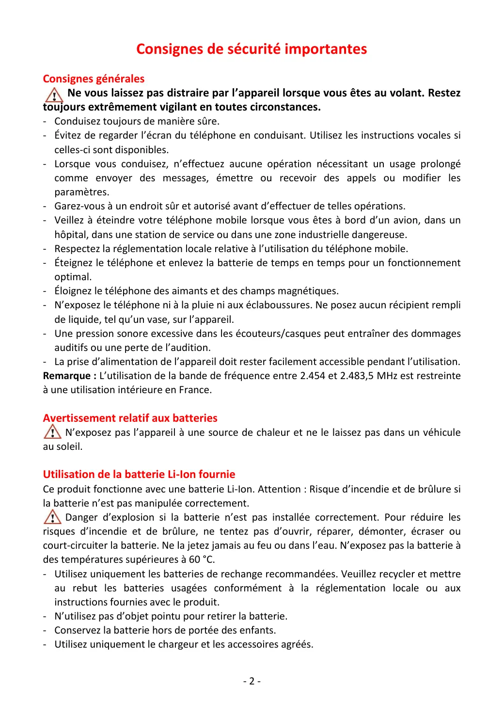 Consignes de sécurité importantes Consignes générales Ne vous laissez pas distraire par l’appareil lorsque vous êtes au volant. Restez toujours extrêmement vigilant en toutes circonstances. - Conduisez toujours de manière sûre. - Évitez de regarder l’écran du téléphone en conduisant. Utilisez les instructions vocales si celles-ci sont disponibles. - Lorsque vous conduisez, n’effectuez aucune opération nécessitant un usage prolongé comme envoyer des messages, émettre ou recevoir des appels ou modifier les paramètres. - Garez-vous à un endroit sûr et autorisé avant d’effectuer de telles opérations. - Veillez à éteindre votre téléphone mobile lorsque vous êtes à bord d’un avion, dans un hôpital, dans une station de service ou dans une zone industrielle dangereuse. - Respectez la réglementation locale relative à l’utilisation du téléphone mobile. - Éteignez le téléphone et enlevez la batterie de temps en temps pour un fonctionnement optimal. - Éloignez le téléphone des aimants et des champs magnétiques. - N’exposez le téléphone ni à la pluie ni aux éclaboussures. Ne posez aucun récipient rempli de liquide, tel qu’un vase, sur l’appareil. - Une pression sonore excessive dans les écouteurs/casques peut entraîner des dommages auditifs ou une perte de l’audition. - La prise d’alimentation de l’appareil doit rester facilement accessible pendant l’utilisation. Remarque : L’utilisation de la bande de fréquence entre 2.454 et 2.483,5 MHz est restreinte à une utilisation intérieure en France. Avertissement relatif aux batteries N’exposez pas l’appareil à une source de chaleur et ne le laissez pas dans un véhicule au soleil. Utilisation de la batterie Li-Ion fournie Ce produit fonctionne avec une batterie Li-Ion. Attention : Risque d’incendie et de brûlure si la batterie n’est pas manipulée correctement. Danger d’explosion si la batterie n’est pas installée correctement. Pour réduire les risques d’incendie et de brûlure, ne tentez pas d’ouvrir, réparer, démonter, écraser ou court-circuiter la batterie. Ne la jetez jamais au feu ou dans l’eau. N’exposez pas la batterie à des températures supérieures à 60 °C. - Utilisez uniquement les batteries de rechange recommandées. Veuillez recycler et mettre au rebut les batteries usagées conformément à la réglementation locale ou aux instructions fournies avec le produit. - N’utilisez pas d’objet pointu pour retirer la batterie. - Conservez la batterie hors de portée des enfants. - Utilisez uniquement le chargeur et les accessoires agréés.