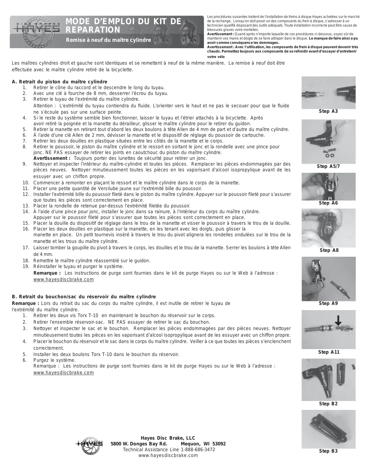 Remarque : Les instructions de purge sont fournies dans le kit de purge Hayes ou sur le Web à l’adresse : www.hayesdiscbrake.com Step A3 Step A5/7 Step A6 Step A8 Step A9 Step A11 Step B2 Hayes Disc Brake, LLC 5800 W. Donges Bay Rd. Mequon, WI 53092 Technical Assistance Line 1-888-686-3472 www.hayesdiscbrake.com Step B3