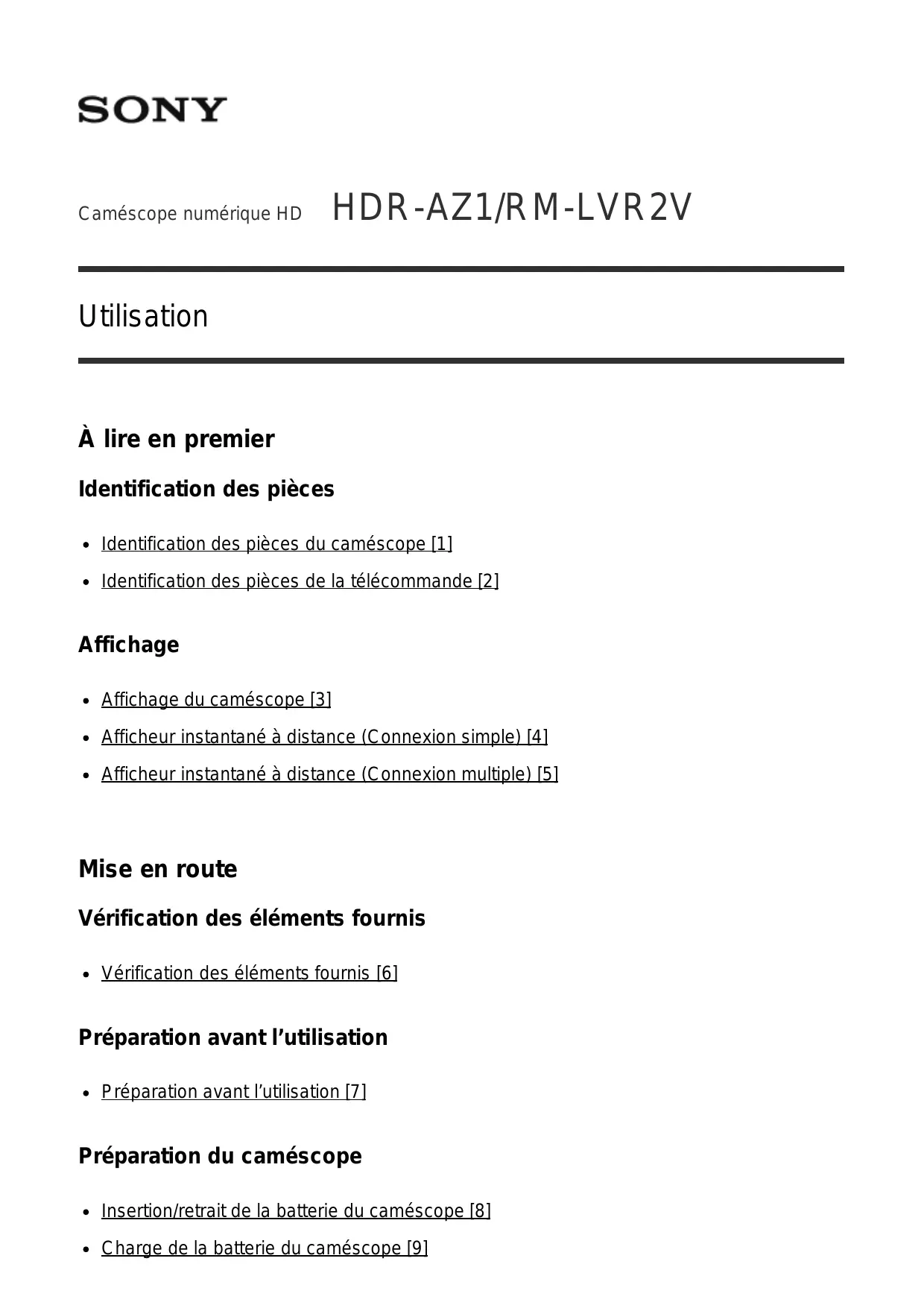 Utilisation À lire en premier Identification des pièces Identification des pièces du caméscope [1] Identification des pièces de la télécommande [2] Affichage Affichage du caméscope [3] Afficheur instantané à distance (Connexion simple) [4] Afficheur instantané à distance (Connexion multiple) [5] Mise en route Vérification des éléments fournis Vérification des éléments fournis [6] Préparation avant l’utilisation Préparation avant l’utilisation [7] Préparation du caméscope Insertion/retrait de la batterie du caméscope [8] Charge de la batterie du caméscope [9] Insertion/éjection d’une carte mémoire dans/du caméscope [10] Cartes mémoire compatibles avec le caméscope [11] Mise sous/hors tension du caméscope [12] Préparation de l’afficheur instantané à distance Charge de l’afficheur instantané à distance [13] Fixation du bracelet à l’afficheur instantané à distance [14] Mise sous/hors tension de l’afficheur instantané à distance [15] Modification du réglage de la date et de l’heure à partir de l’afficheur instantané à distance [16] Données d’assistance du GPS [17] Connexion de l’afficheur instantané à distance à un caméscope (Connexion simple) Vérification du mode de connexion du caméscope [18] Vérification du mode de connexion de l’afficheur instantané à distance [19] Connexion de l’afficheur instantané à distance à un caméscope [20] Établissement d’une connexion correcte [21] Connexion de l’afficheur instantané à distance à plusieurs caméscopes (Connexion multiple) Connexion de l’afficheur instantané à distance à plusieurs caméscopes [22] Réinitialisation des informations de connexion des caméscopes enregistrés [23] Connexion du caméscope à votre smartphone Installation de l’application sur votre smartphone [24] Vérification de l’ID/mot de passe [25] Connexion à un smartphone Android compatible NFC à l’aide des fonctions par simple contact [26] Connexion à un smartphone Android [27] Connexion à l’iPhone [28] Autres préparatifs (Utilisation des accessoires) Utilisation de l’adaptateur de trépied [29] Utilisation du boîtier étanche à l’eau (SPK-AZ1) [30] Fixation du support adhésif [31] Prise de vue Enregistrement de films ou prise de vue de photos Commutateur REC HOLD (verrouillage) [32] Fonction de maintien des touches de l’afficheur instantané à distance [33] Commutation du mode de prise de vue [34] Mode film [35] Mode photo [36] Mode d’enregistrement de photos à intervalle [37] Enregistrement pendant une période prolongée [38] Modification des paramètres de l’afficheur instantané à distance Liste des options de réglage Liste des options de réglage [39] Paramètres des films Réglage de la qualité d’image [40] SteadyShot [41] Inversion (Films) [42] Scène (Film) [43] Réglage de la couleur [44] Format d’enregistrement des films [45] Paramètres des images fixes Inversion (Images fixes) [46] Scène (Images fixes) [47] Prise de vue en continu [48] Intervalle de prise de vue en continu [49] Retardateur [50] Paramètres des photos à intervalle Inversion (Enregistrement de photos à intervalle) [51] Scène (Enregistrement de photos à intervalle) [52] Accéléré [53] Paramètres de connexion des périphériques Réglage du code temporel/bit utilisateur [54] Télécommande IR [55] Commutation NTSC/PAL [56] Mise hors tension automatique [57] Bip [58] Formatage [59] Paramètres de la télécommande Rotation de l’écran [60] Luminosité du moniteur [61] Réglage de la date et de l’heure [62] Réinitialiser les paramètres [63] Version [64] Mode de connexion [65] Réglage du GPS [66] Mode avion [67] Réinitialisation des paramètres réseau de la connexion multiple [68] Visualisation Visualisation Lecture à l’aide de l’afficheur instantané à distance [69] Commutation de l’affichage du caméscope et de l’afficheur instantané à distance Commutation du mode de connexion du caméscope [70] Commutation de l’écran LCD de l’afficheur instantané à distance [71] Suppression Suppression [72] Diffusion en direct de films Diffusion en direct avec le caméscope (Connexion en direct) Diffusion en direct [73] Préparation de la diffusion en direct [74] Exécution de la diffusion en direct [75] Ordinateur Action Cam Movie Creator Fonctions utiles de Action Cam Movie Creator [76] Vérification de l’environnement de l’ordinateur [77] Installation de Action Cam Movie Creator [78] Déconnexion de l’ordinateur (Windows 7/Windows 8) [79] Déconnexion de l’ordinateur (Windows Vista) [80] Importation des données d’assistance du GPS Données d’assistance du GPS [81] Autres Durée d’enregistrement et de lecture estimée de la batterie du caméscope Durée d’enregistrement estimée de la batterie du caméscope [82] Durée de lecture estimée de la batterie du caméscope [83] Durée enregistrable, le nombre de photos enregistrables sur une carte mémoire Durée d’enregistrement estimée de films en continu [84] Estimation du nombre de photos enregistrables [85] Remarque sur l’utilisation Remarques sur l’utilisation du caméscope et de l’afficheur instantané à distance [86] À propos de la condensation de l’humidité [87] Entretien et rangement [88] Remarques relatives aux accessoires en option [89] Remarque relative à la mise au rebut/au transfert de la carte mémoire [90] Batteries du caméscope et de l’afficheur instantané à distance [91] Les limitations de la diffusion en direct du caméscope [92] GPS et la fonction Wi-Fi en cas de distribution [93] Connexion réseau [94] Diffusion en direct simultanée avec plusieurs caméscopes [95] Influence de l’état de la ligne [96] Connexion de la diffusion en direct [97] Durée de distribution continue [98] Limitation de connexion [99] Écran LCD de l’afficheur instantané à distance [100] Étanchéité à l’eau de l’afficheur instantané à distance [101] GPS [102] Mis